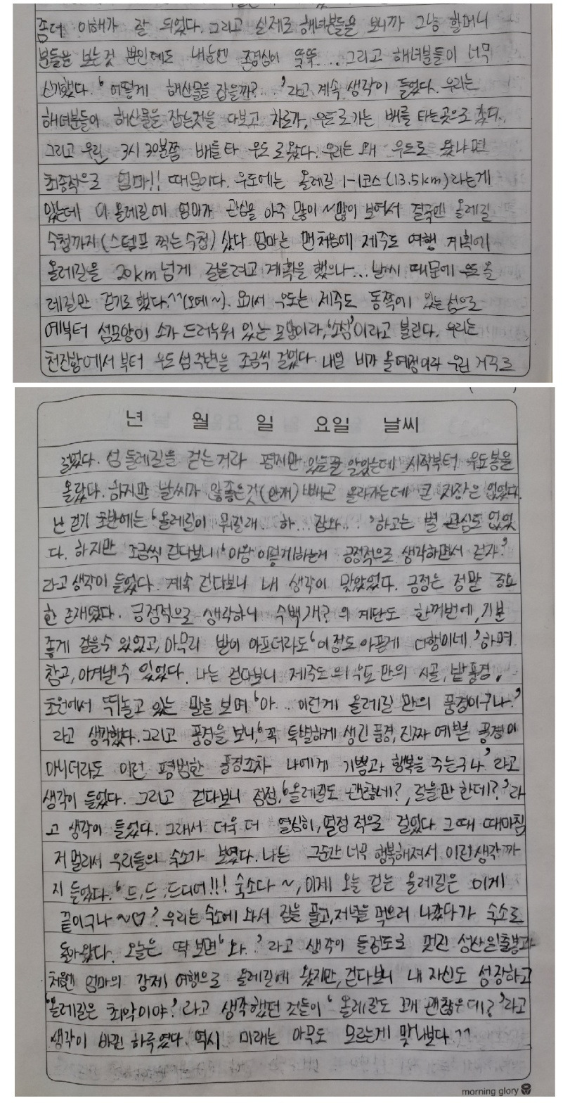 오늘은 딱 보면 '와..'라는 생각이 들 정도로 멋진 성산일출봉과 처음엔 엄마의 강제 여행으로 올레길에 왔지만, 걷다 보니 나 자신도 성장하고 '올레길은 최악이야'라고 생각했던 것들이 '올레길도 꽤 괜찮은데?'라고 생각이 바뀐 하루였다.