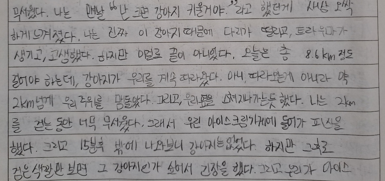 나는 맨날 "난 크면 강아지 키울 거야"라고 했던 게 새삼 오싹하게 느껴졌다. 나는 진짜 이 강아지 때문에 다리가 떨리고, 트라우마가 생기고, 고생했다. 하지만 이걸로 끝이 아니었다. 오늘은 총 8.6km를 걸어야 하는데, 강아지가 우리를 계속 따라왔다. 아니 따라오는 게 아니라 약 2km 넘게 우리 주위를 맴돌았다. 그리고 우리 옆을 스쳐 지나가는 듯했다. 나는 2km를 걷는 동안 너무 무서웠다. 그래서 우린 아이스크림가게에 들어가 피신을 했다. 그리고 15분 후 밖에 나와보니 강아지는 없었다. 하지만 그 후로 검은 색깔만 보면 그 강아지인가 싶어서 긴장을 했다.