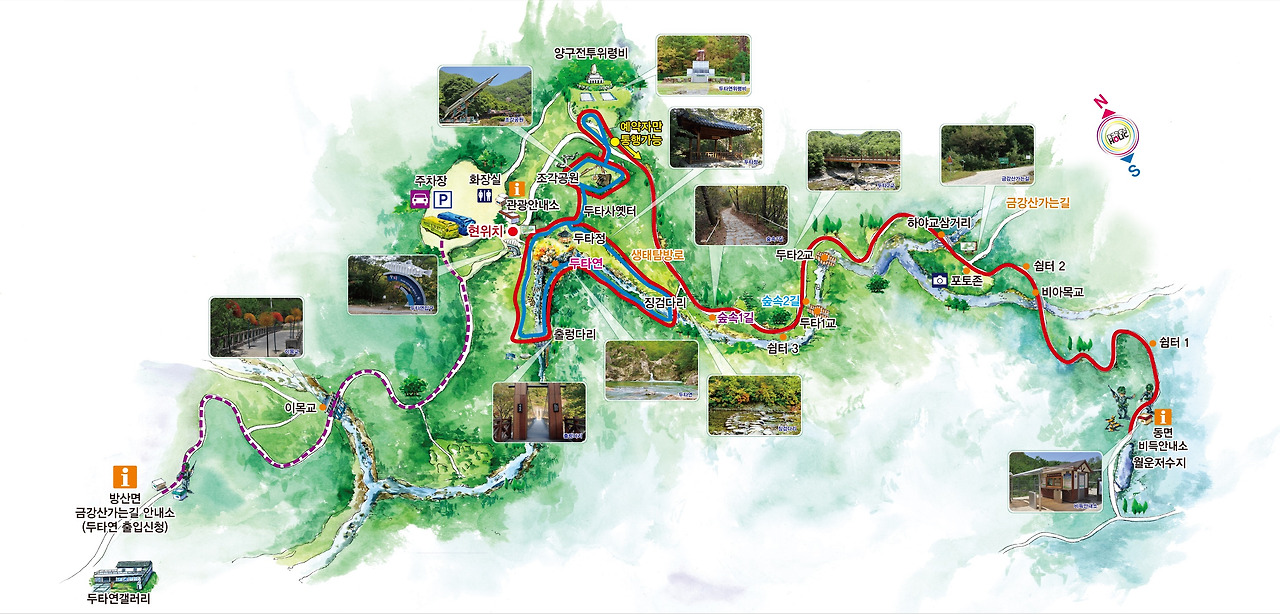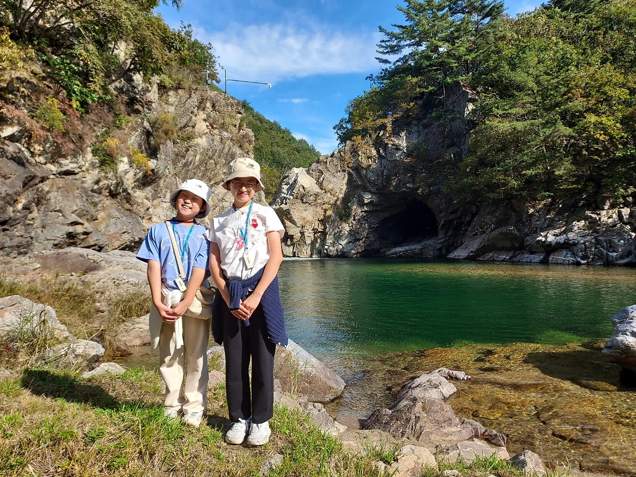 멀리 물고기가 있는 큰 안내조형물에 '두타연'이라는 글자가 보였다. 그 앞에는 사람들이 10명 정도 모여있다. 우리도 주차를 하고 간단히 짐을 챙겨 해설사이자 우릴 인솔해 주실 선생님 앞으로 서둘러 다가갔다. 60대 할머니로 보이는 선생님께서는 아이들을 보며 몇 학년인지, 어느 지역에서 왔는지 등 물어보시며 우리를 반갑게 맞아주셨다.