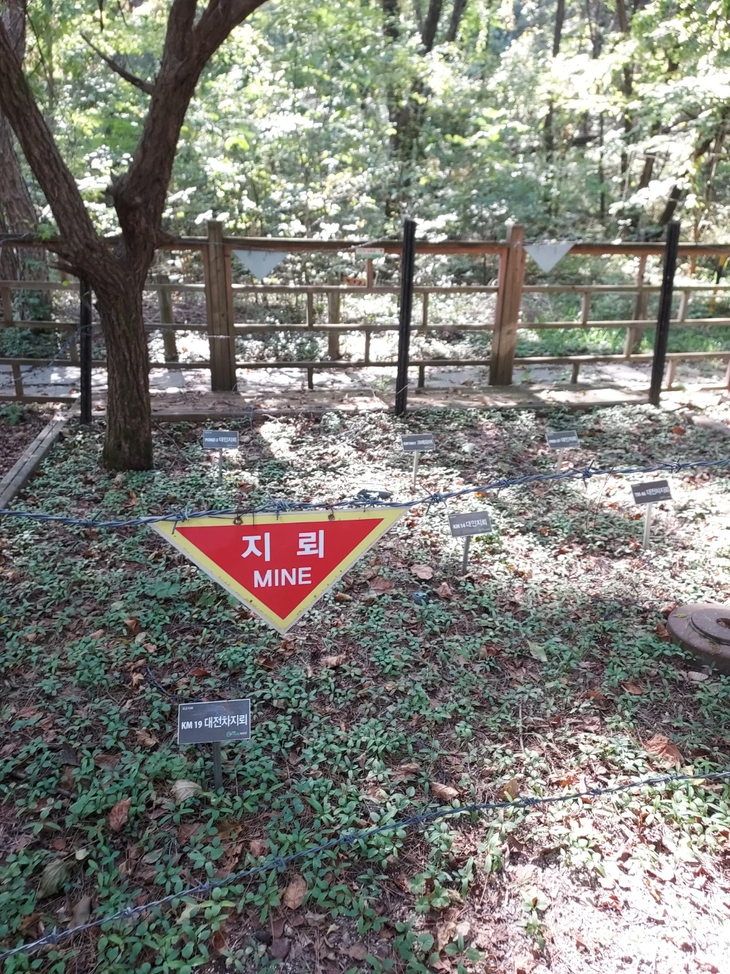 징검다리와 두타교를 지나, 다시 원시림의 숲길을 걷다 보니 나타난, 철조망에 둘러싸인 '지뢰'. 꼭 이곳뿐만이 아니라 숲길을 걷다 보면 눈에 띄였던 '지뢰' 표시. 사람들에게는 잔혹한 전쟁의 아픔을 떠오르게 하는 위험의 표시지만, 철조망 안의 숲은 사람의 손이 닿지 않아 희귀 식물이 자랄 수 있는 자연 그대로의 모습을 보존하고 있어, 사람과 자연에게 '지뢰'가 서로 어떤 의미인지 생각해 보았던 것 같다.