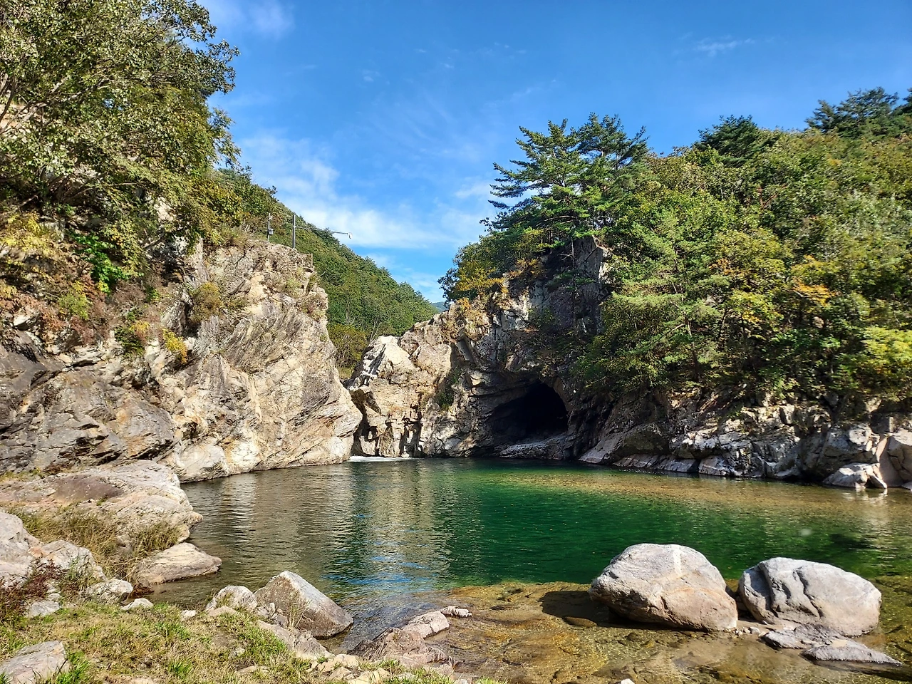 정면에서 보는 두타연은 햇빛에 반사되는 물빛과 조각 같았던 돌과 동굴, 그리고 돌 틈에서 자라났던 나무들이 함께 조화를 이루어 몽환적인 모습을 내뿜고 있었다.