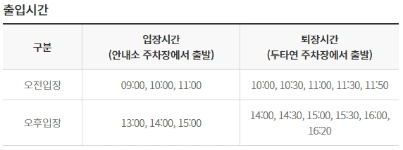 출입신청서(서약서) 작성 - 안내소 접수 - 신분증 제시 - 차량 점검 - 이목정 초소 이동 후 차량 재점검 및 서약서 제출 - 두타연 입장
