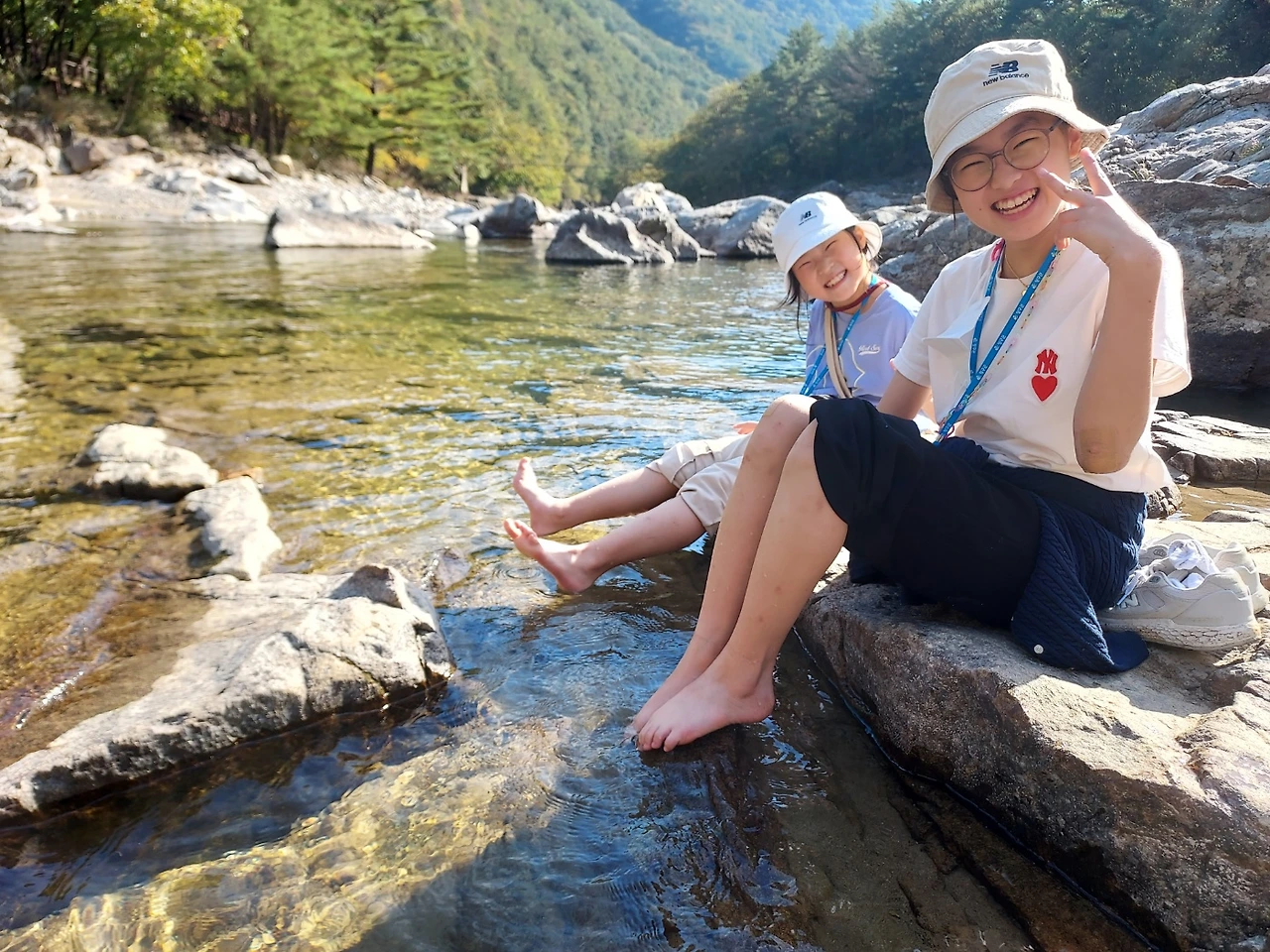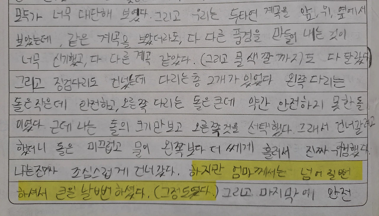 초등학교 5학년이었던 첫째 아이의 일기 중, 어느 일부분.우리는 두타연 계곡을 앞. 위. 옆에서 보았는데, 같은 계곡을 보았더라도 다 다른 풍경을 만들어 내는 것이 너무 신기했고, 다 다른 계곡 같았다.(그리고 물 색깔까지도 다 달랐다) 그리고 징검다리도 건넜는데 다리는 총 2개가 있었다. 왼쪽다리는 돌은 작은데 안전하고 오른쪽 다리는 돌은 큰데 약간 안전하지 못한 돌이었다. 근데 나는 돌의 크기만 보고 오른쪽 것을 선택했다. 그래서 건너갈려고 했더니 돌은 미끄럽고 물이 왼쪽보다 더 쎄게 흘러서 진짜 위험했다. 나는 진짜 조심스럽게 건너갔다. 하지만 엄마께서는 넘어질뻔 하셔서 큰일날뻔하셨다(그 정도였다)