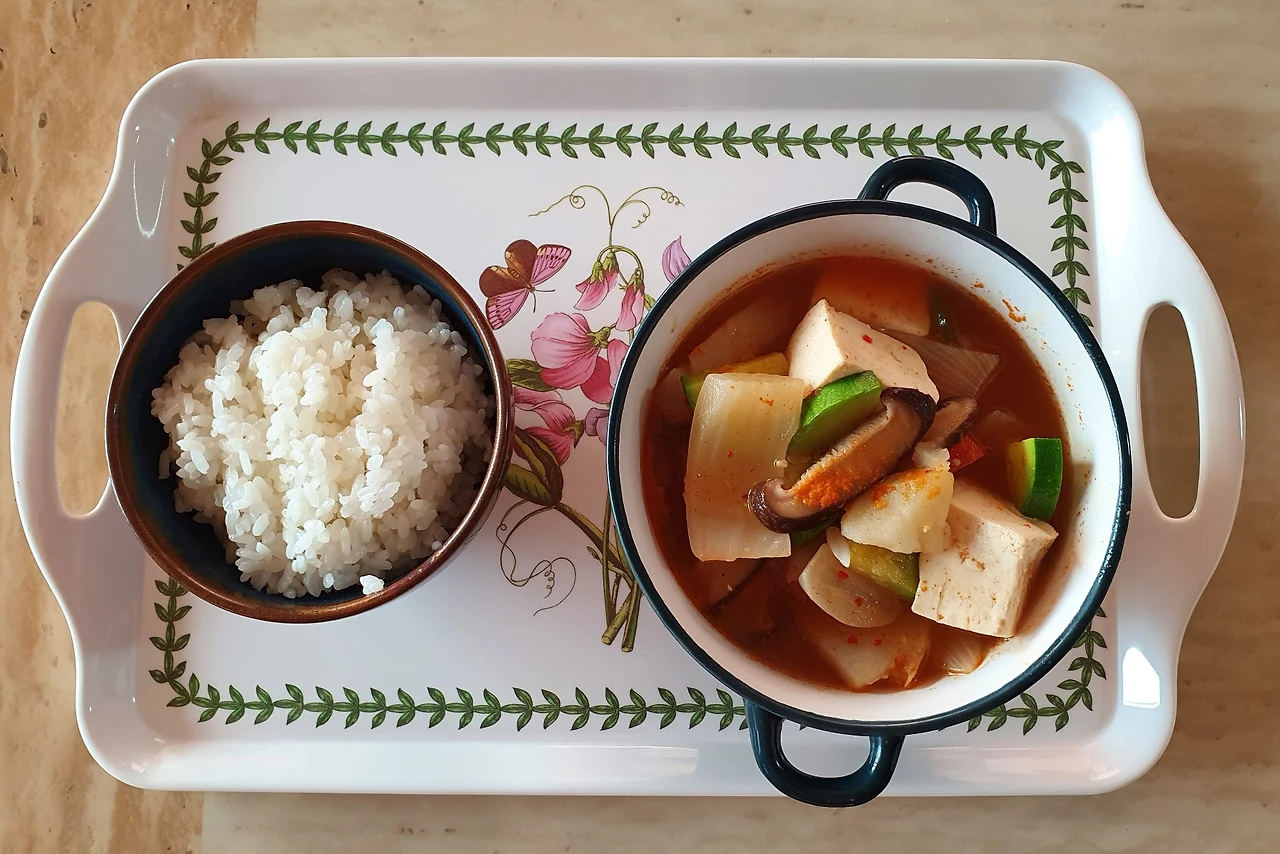 긴 시간이 걸려서 나는 고추장찌개를 만들었고 아이는 노력한 엄마에게 칭찬의 의미로 "아주 맛있어요!"라고 말하면서 먹었다.