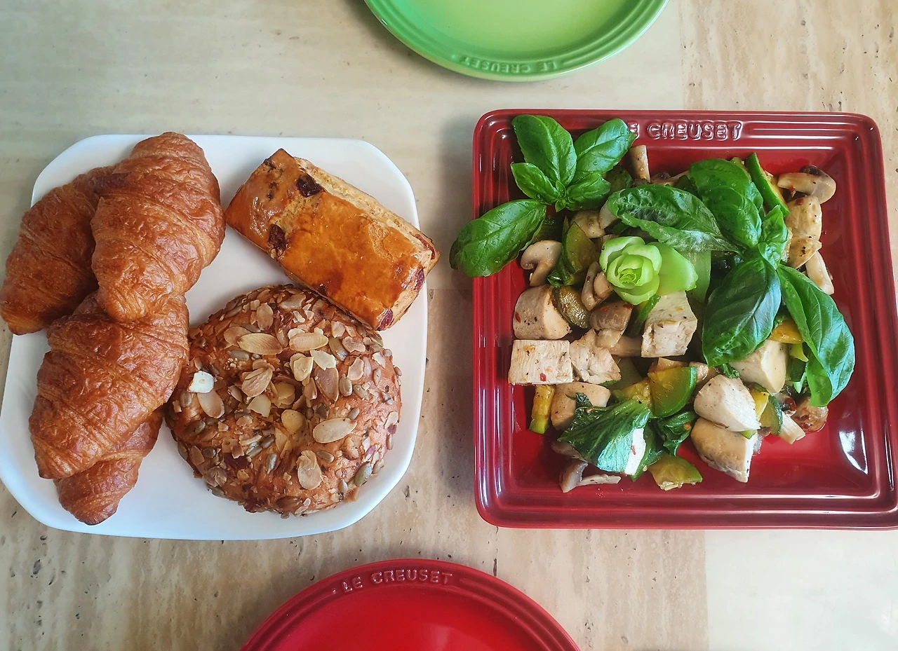 오븐에 마트에서 구입한 미니 크루아상과 집에 있는 빵을 함께 넣어서 데워내었다. 그러면 마치 갓 구운 빵처럼 먹을 수 있다.