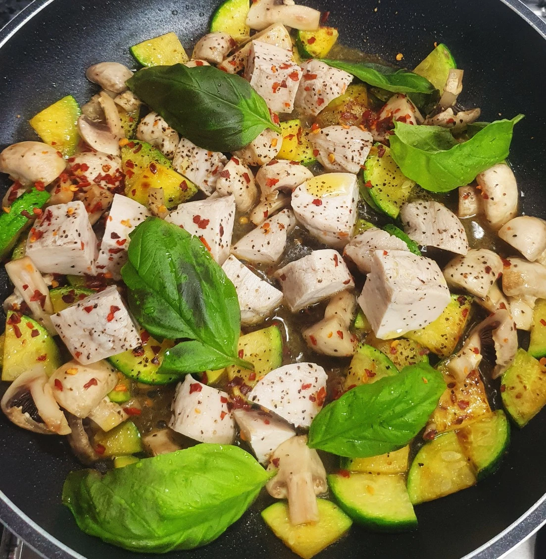 달구어진 프라이팬에 애호박과 양송이버섯 그리고 올리브 오일을 넣고 익히다가 이탈리아 레드페퍼와 닭가슴살을 넣고 볶아준다. (생닭가슴살은 채소보다 먼저 익혀주고 나중에 채소를 넣어주어야 한다.)