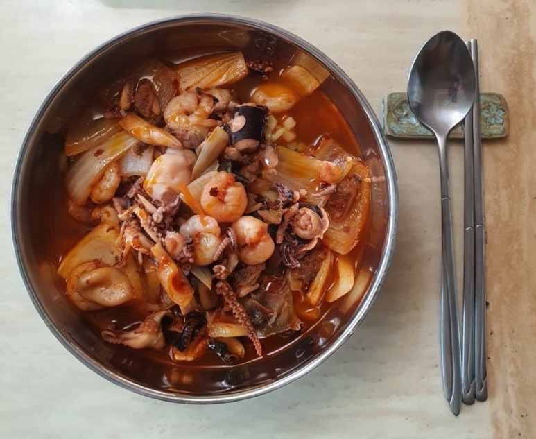 신랑이 요리한 냉동 해물을 넣은 짬뽕과 외부에서 포장해온 사골곰탕