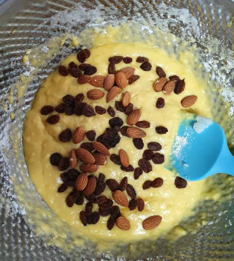 반죽이 잘 섞이면 마지막에 아몬드, 건포도를 넣어준다.