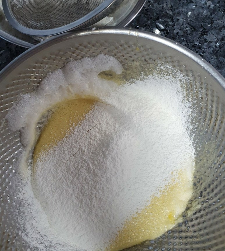 밀가루에 베이킹파우더를 넣고 섞은 다음에 거품 반죽이 있는 곳에 채를 쳐서 내려준다.