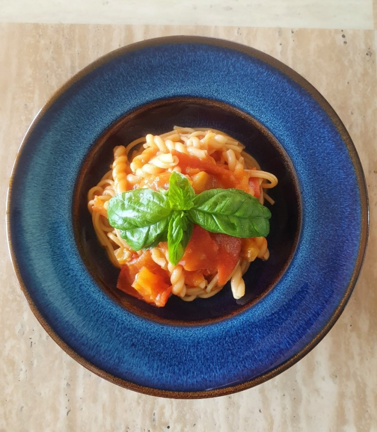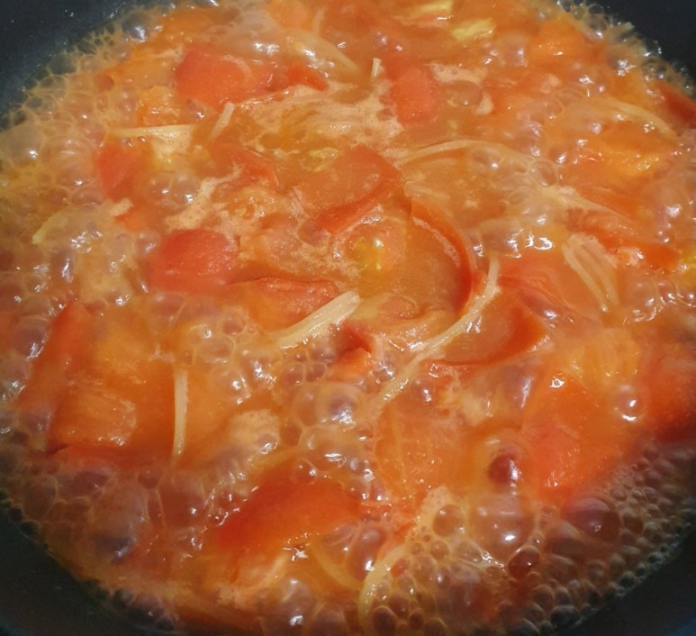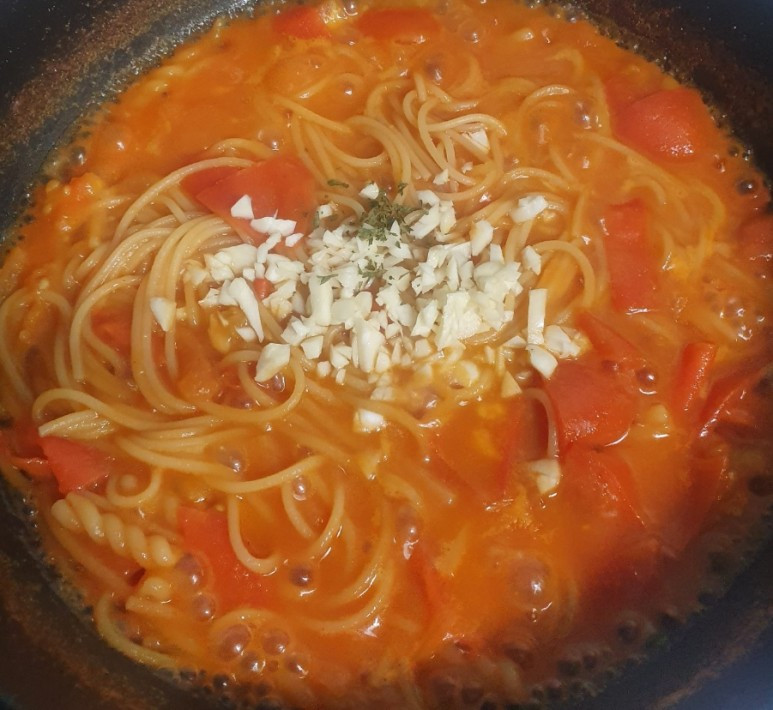 알맞은 크기로 토마토를 썰어서 궁중팬에 넣고 적당히 물을 부은 다음에 버터와 간장 그리고 설탕을 넣어서 간을 맞추고 끓였다. 그리고 스파게티 면을 넣고 13분 정도 더 끓인 후에 마늘을 잘게 다지고 이탈리안 파슬리를 함께 넣어서 휘휘 저어주었다.