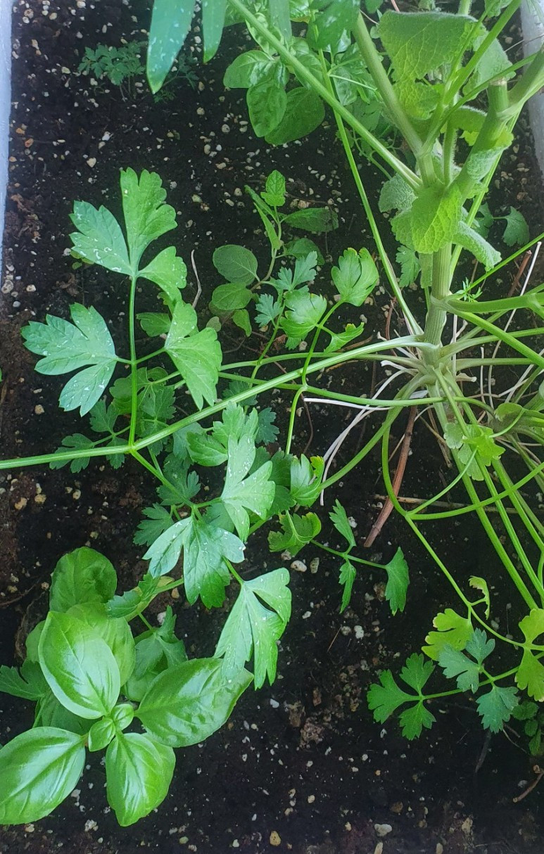 베란다에서 자라고 있는 바질과 이탈리안 파슬리