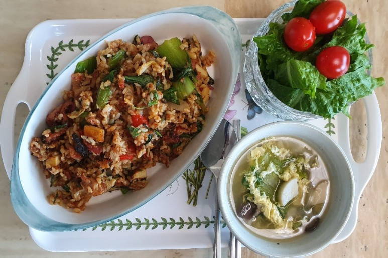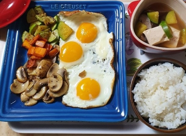 아이가 청경채와 양송이버섯이 들어간 달걀찜과 청경채와 순두부가 들어간 된장찌개를 좋아해서 나는 열심히 만들었다. 이 두 가지 요리는 아이가 어렸을 때부터 만들었고 여러 번의 시행착오 끝에 이제는 내가 웬만큼 잘 만들 수 있는 요리이다. 위에 감자 부침개와 함께 아이가 든든하게 잘 먹었다.