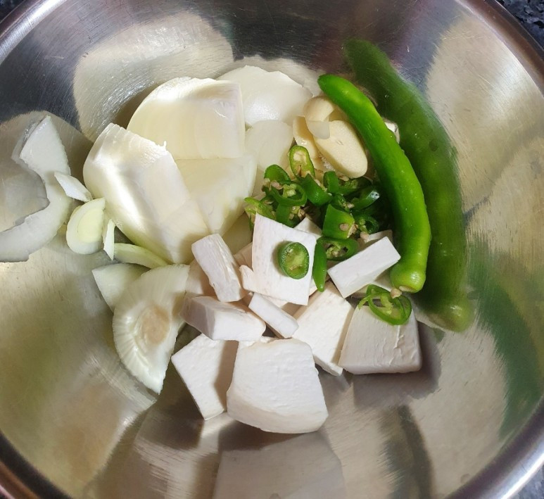 아이가 수제비 반죽해 준 것과 냉장고 안에 있는 양파와 새송이버섯 그리고 청양고추와 마늘을 활용하였다.