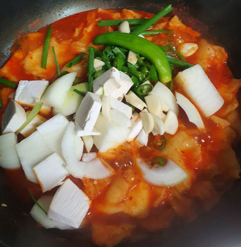 우선 떡볶이 양념을 하고 수제비를 떼어 넣어서 익혀주고 채소들을 넣어서 끓였다.