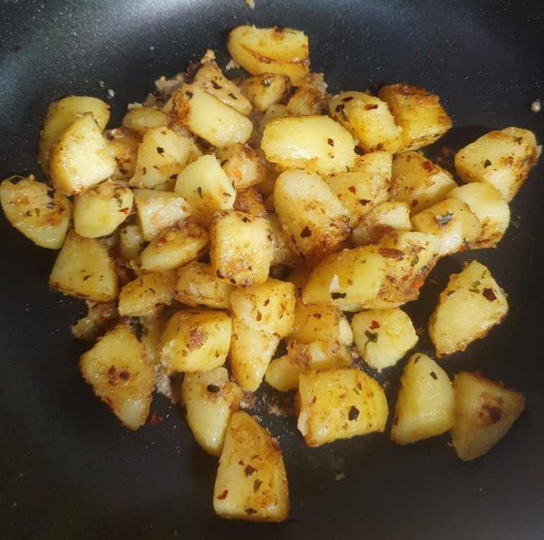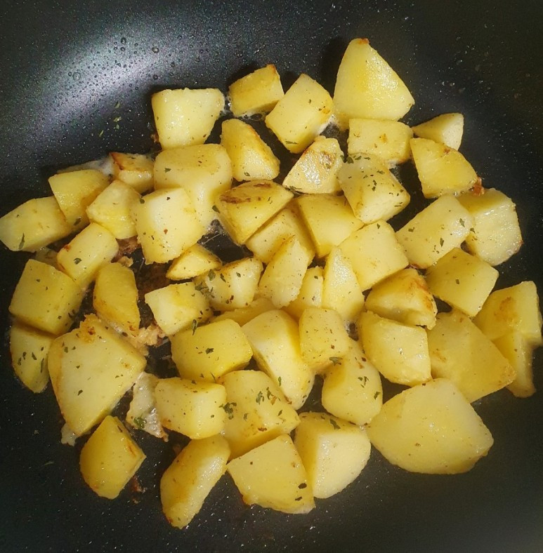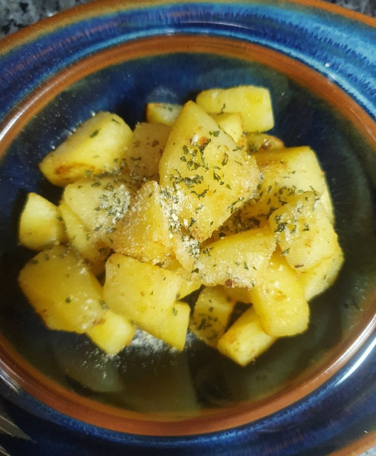 감자를 잘 다듬어서 먹기 좋은 크기로 썰어서 전자레인지에 7분 정도 돌려서 익혀준다. 그리고 프라이팬에 기름을 살짝 두르고 익은 감자를 굽듯이 다시 익히면서 이탈리안 레드페퍼와 파슬리 그리고 파마산 치즈가루를 넣어서 골고루 섞어 준다. 마지막에는 버터 한 조각을 넣어주면 맛이 더 좋아진다.