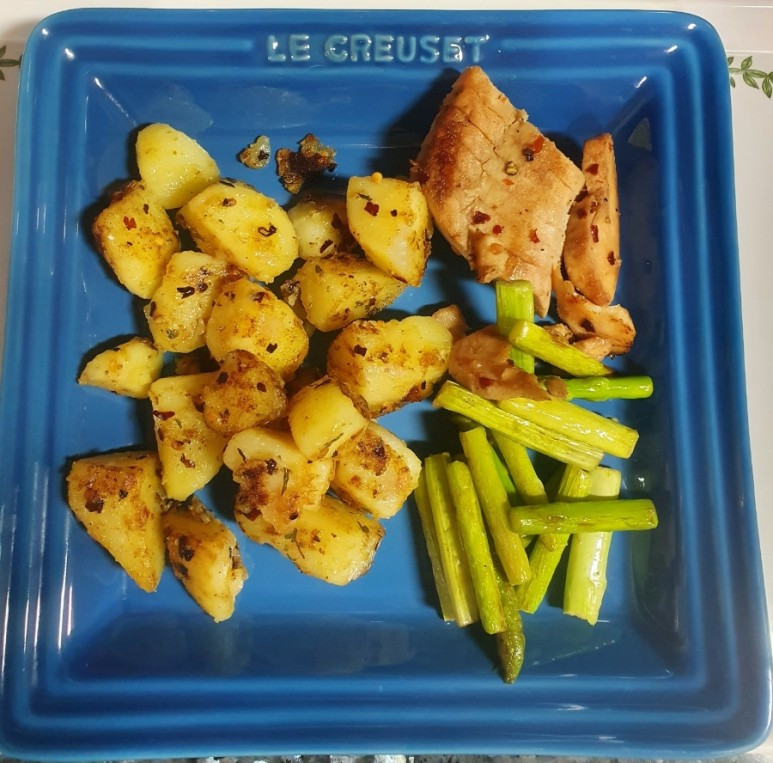한참 성장기인 아이는 많은 양을 먹고 싶어 해서 노란 접시에 푸짐하게 담아 주었고 나를 위해서는 파란 접시에 적당히 담아내었다. 유럽식으로 요리한 버터 감자구이와 아스파라거스 볶음 그리고 닭 가슴살 스테이크는 나와 아이에게 외식 부럽지 않은 한 끼 식사가 되었다.