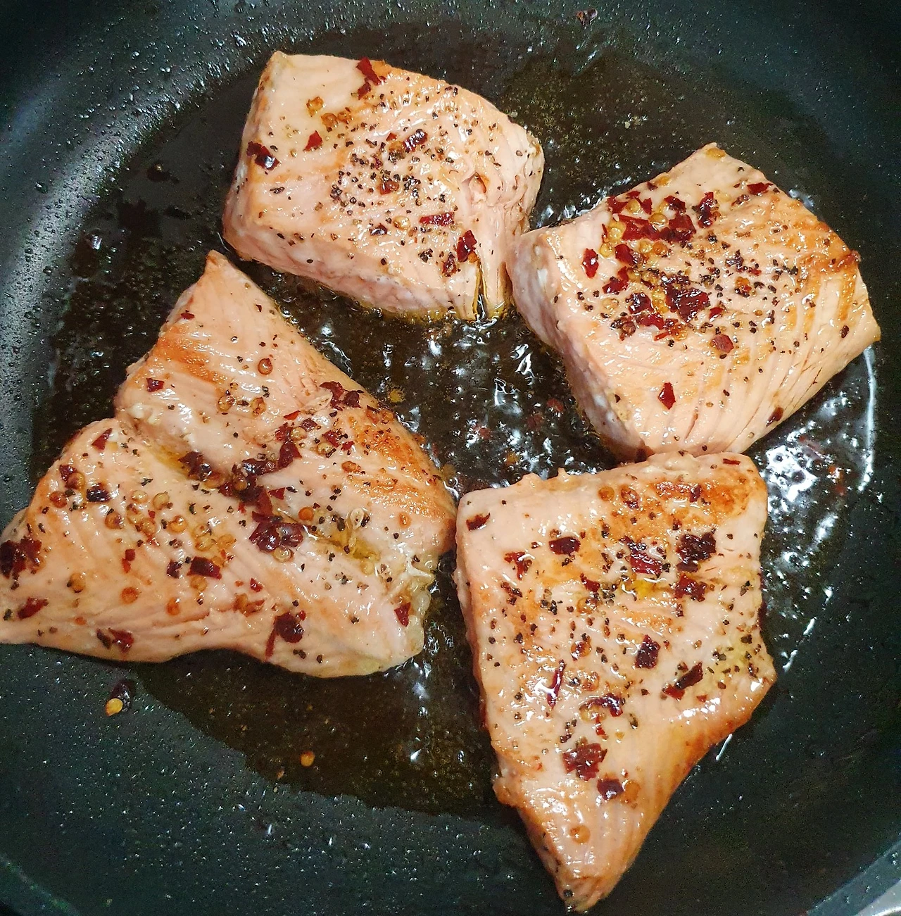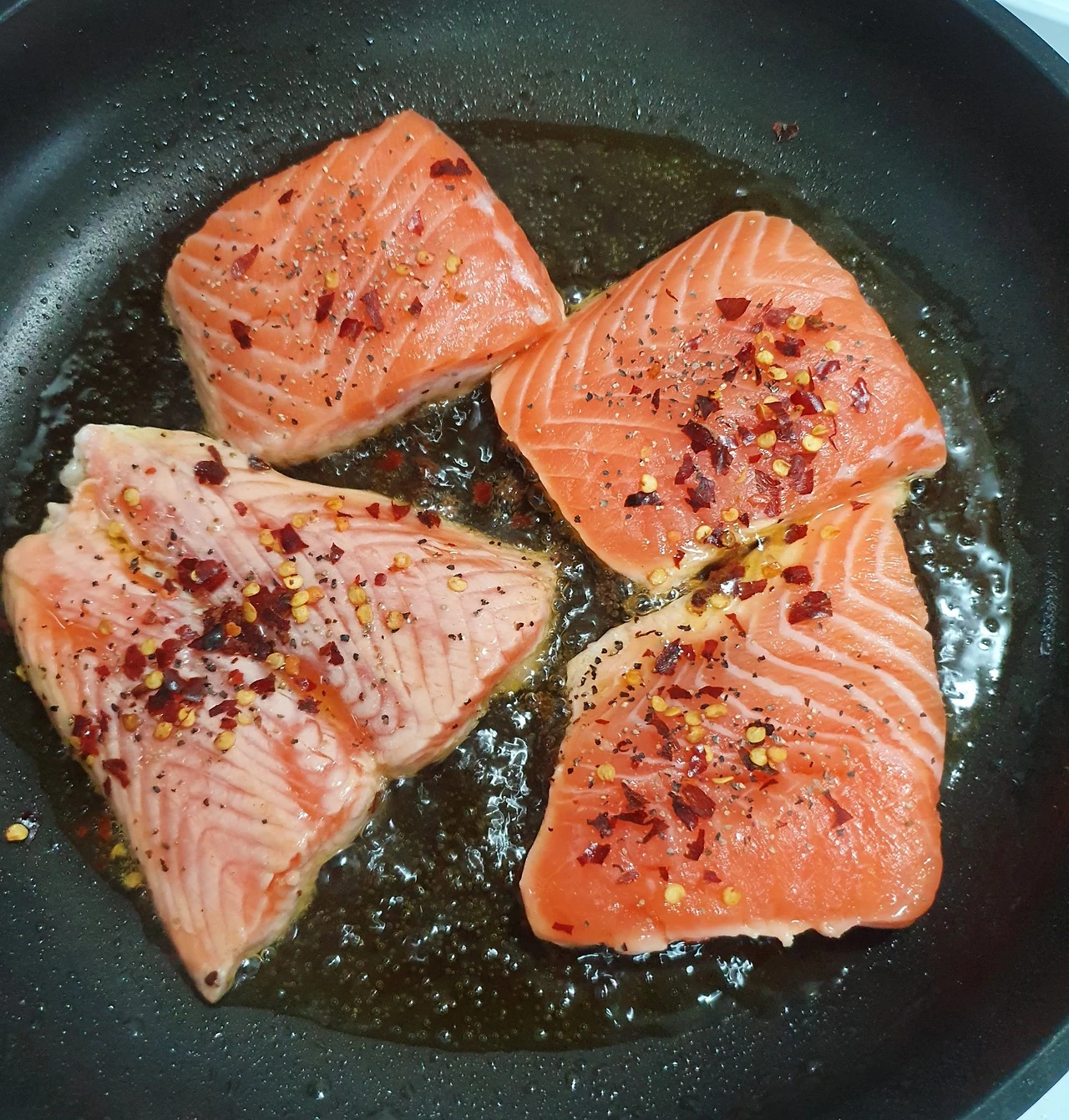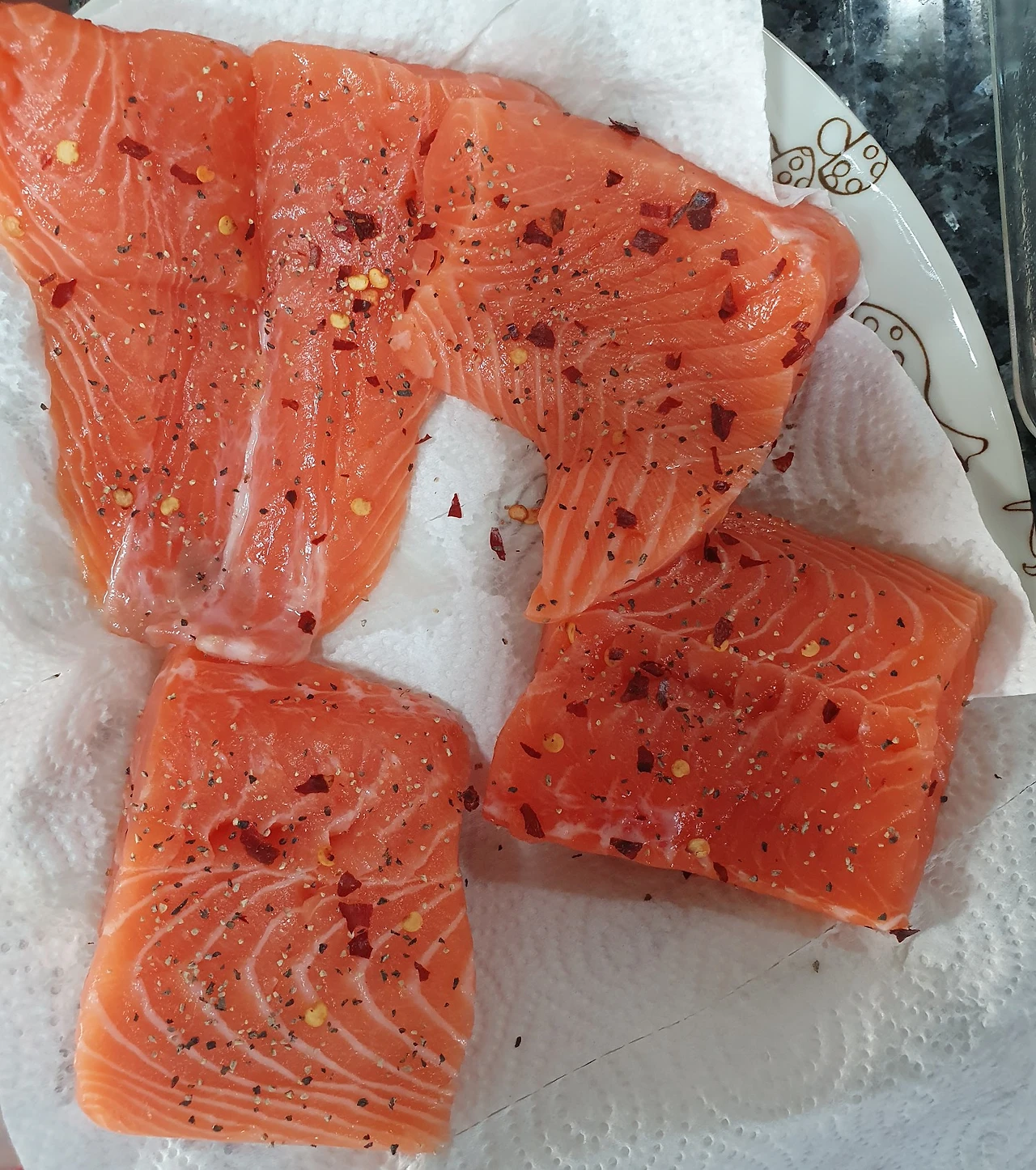 원래는 로즈메리와 올리브 오일 그리고 소금과 레몬즙에 생연어를 재워놨어야 했지만 갑자기 결정한 것이고 아이와 내가 로즈메리보다 오늘은 조금 매콤하게 먹고 싶어서 레드페퍼와 소금 대신 후추를 사용하기로 하였다. 아이가 소금 간이 되어있는 것을 좋아하지 않아서 후추를 사용한다.