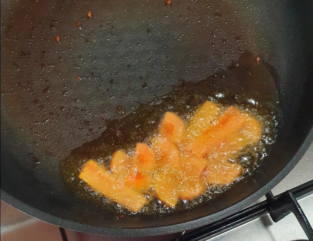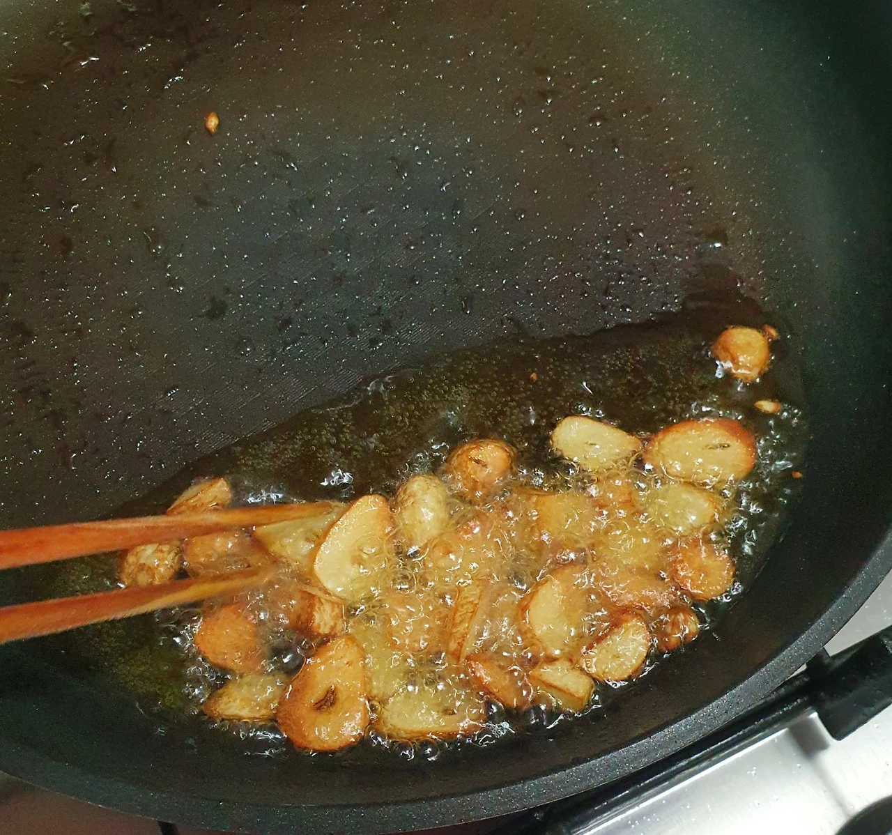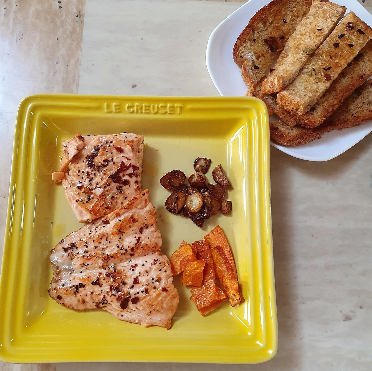 스페인과 이탈리아인 친구들이 늘 나에게 마늘을 편 썰어서 올리브 오일에 튀기듯이 볶은 후 그 마늘향이 베인 올리브 오일로 안심 스테이크나 연어 스테이크를 만들면 맛있다고 강조를 한 말이 생각나서 마늘을 편을 썰어서 튀겨내었고 아이가 튀긴 마늘을 잘 먹어서 따로 두었다. 아이가 당근을 좋아해서 당근도 튀겨내었다. 생연어를 프라이팬에 넣어서 익히기 시작했다. 레드페퍼를 더 넣어서인지 살짝 매콤한 향이 났다. 나는 말로 설명하고 모든 과정을 아이가 직접 하였다. 아이는 본인이 만드는 음식이 제대로 나올지 걱정을 하였고 나는 아이에게 음식이 잘 만들어지지 않아도 우리가 먹을 것이니 괜찮다고 말을 하였다. 아이는 맛있는 연어 스테이크를 만들어서 나와 함께 즐겁게 먹고 싶은 눈치였다.