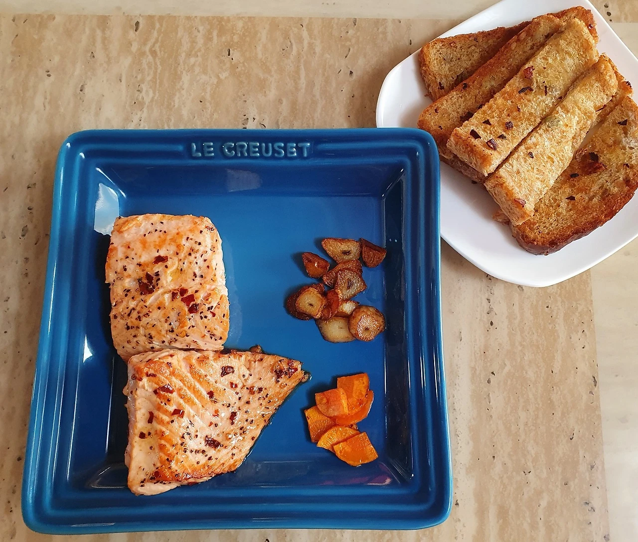 연어가 제대로 익었고 아이가 그릇에 연어와 마늘 그리고 당근을 예쁘게 담아내었다. 아이는 신중하게 각자의 위치를 정해서 담았고 그 심각한 표정의 아이 얼굴이 매우 귀여웠다. 나는 편식이 심해서 당근을 잘 안 먹는다. 그래서 아이에게 당근은 두 조각만 담으라고 말을 하였는데 장난기가 생긴 아이는 당근을 여섯 조각을 담아 놓아서 함께 먹을 때 다시 아이에게 당근 네 조각을 돌려주었다! 기름이 많이 남아서 나는 식빵 두 개를 튀기듯이 구워내어서 잘랐다. 레드페퍼 때문인지 매콤한 향과 마늘 식빵 맛이 나서 아이가 맛이 좋다고 말을 하였다. 아이와 나는 식탁에 음식을 차려 내었고 너무나도 여행이 가고 싶은 마음을 달래기 위해서 여행지에서 들었던 음악을 골라 틀고 서로 마주 앉았다.