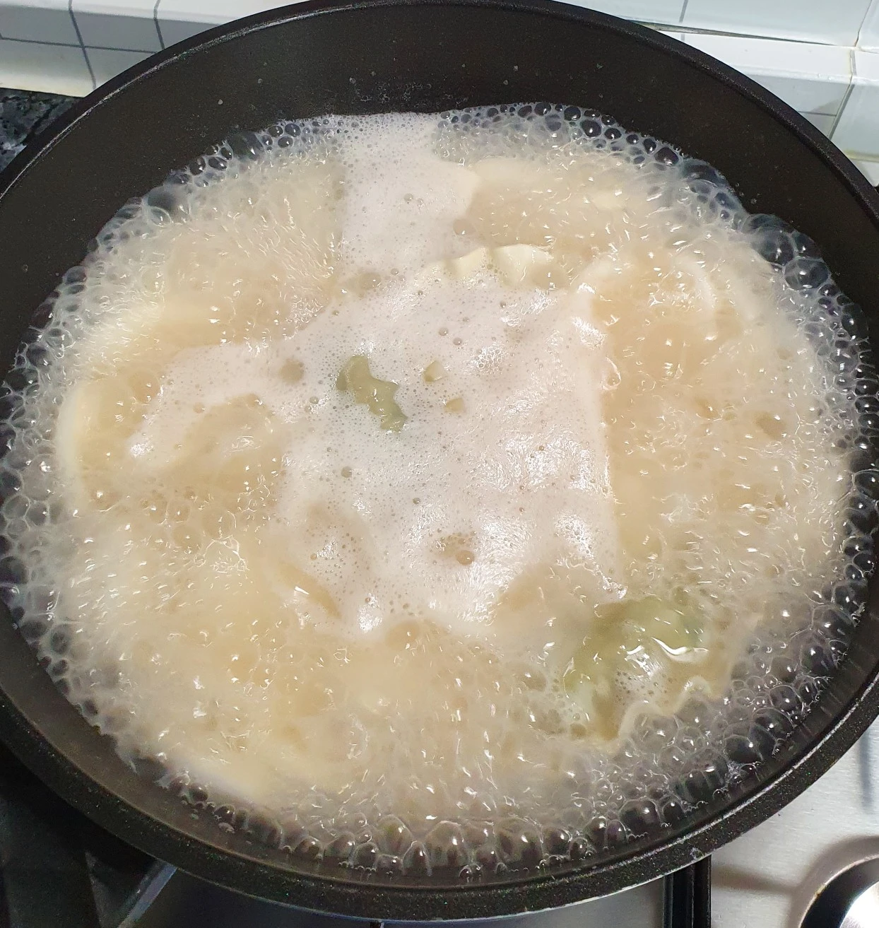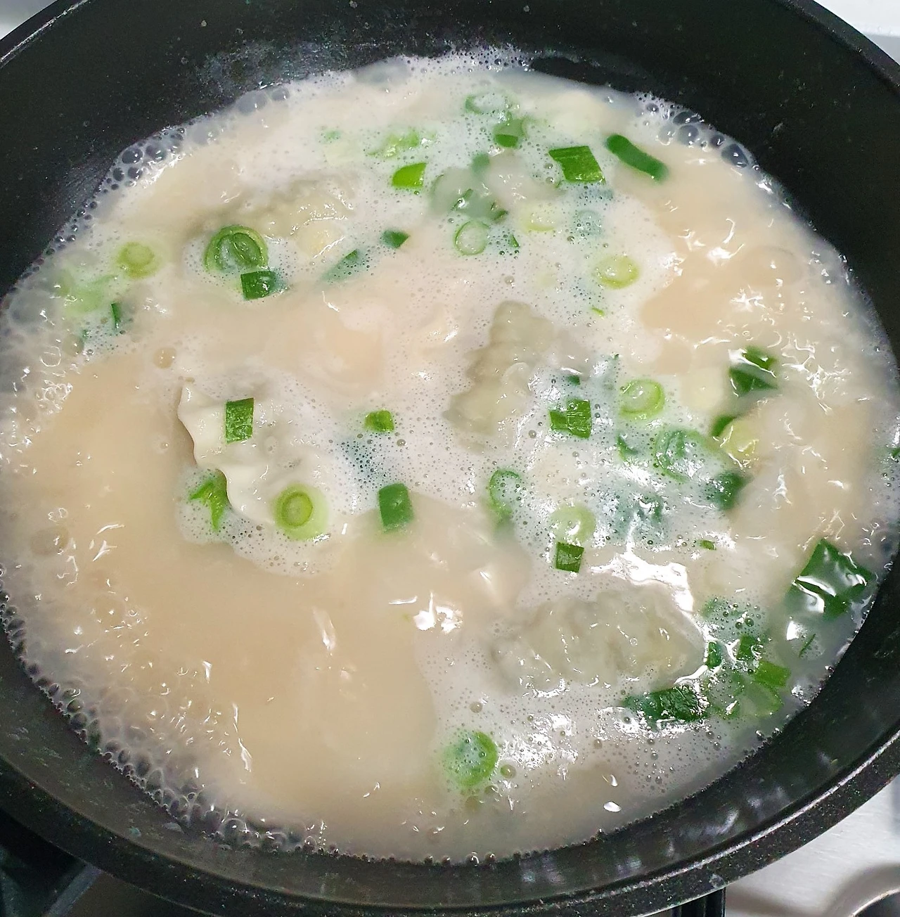 만두가 들어간 지 1~2분 정도 되었을 때 채 썬 파를 넣고 한 김 올라올 때 불을 끄게 하였다.