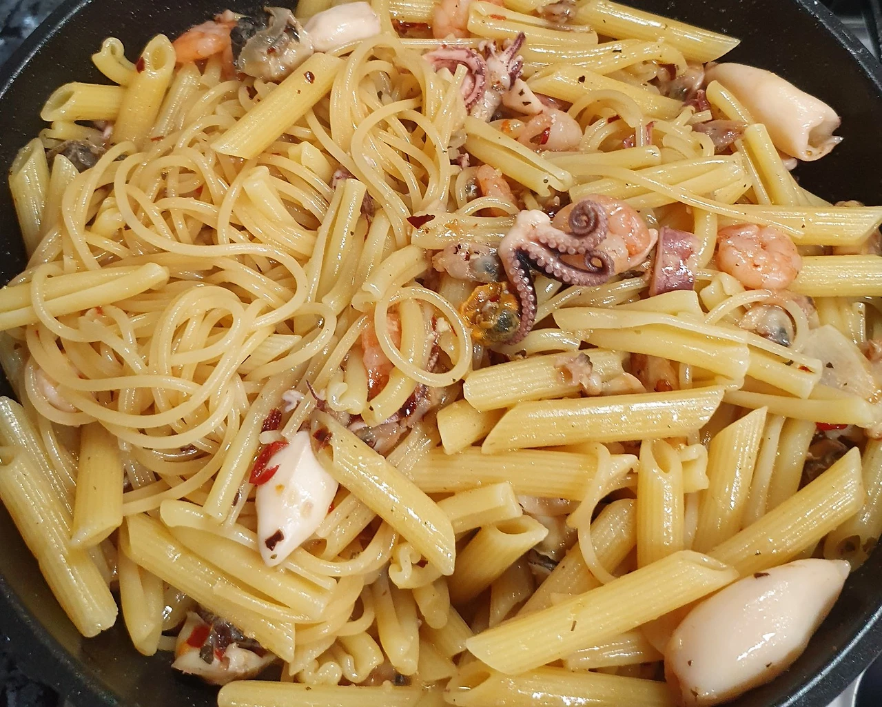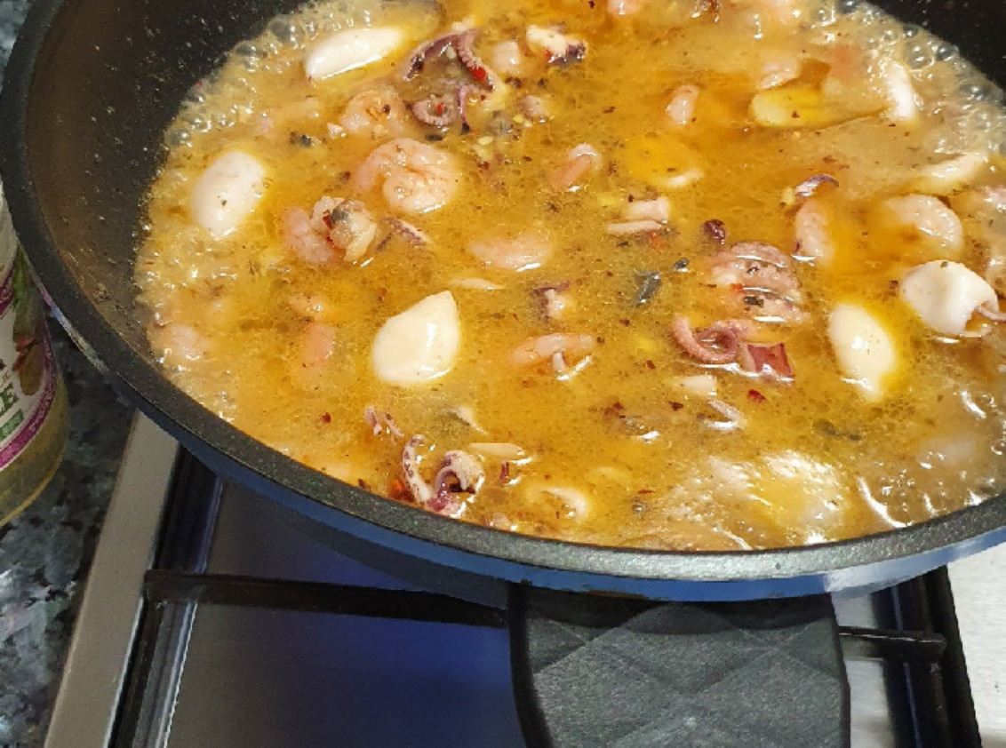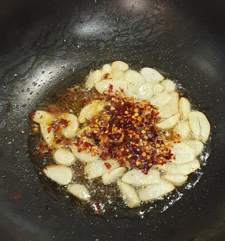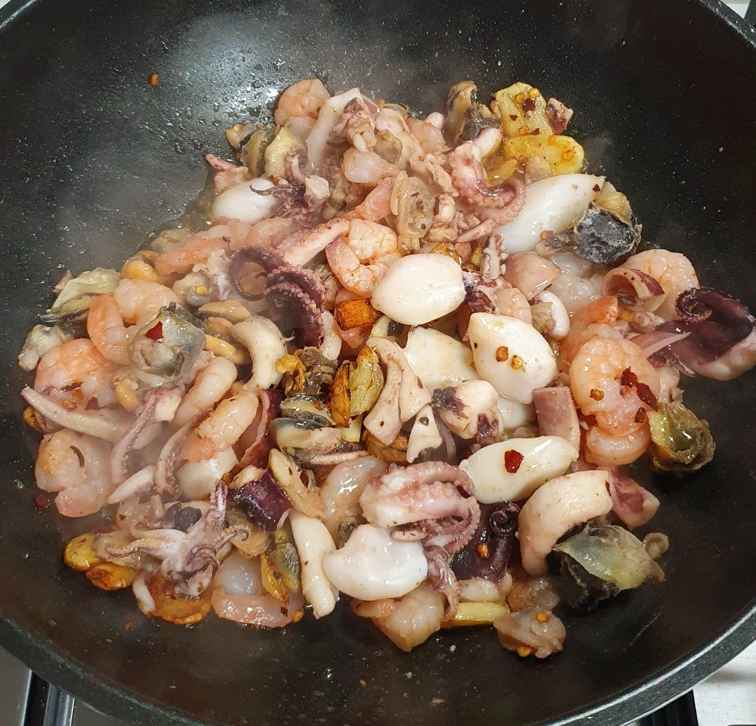 레드페퍼와 마늘 편을 썬 것을 가열한 기름에 넣고 볶다가 해산물을 따로 끓여서 그 끓은 물은 버리고 해산물만 따로 채에 두었다가 기름에 함께 넣는다. 그리고 해산물을 볶아준다.