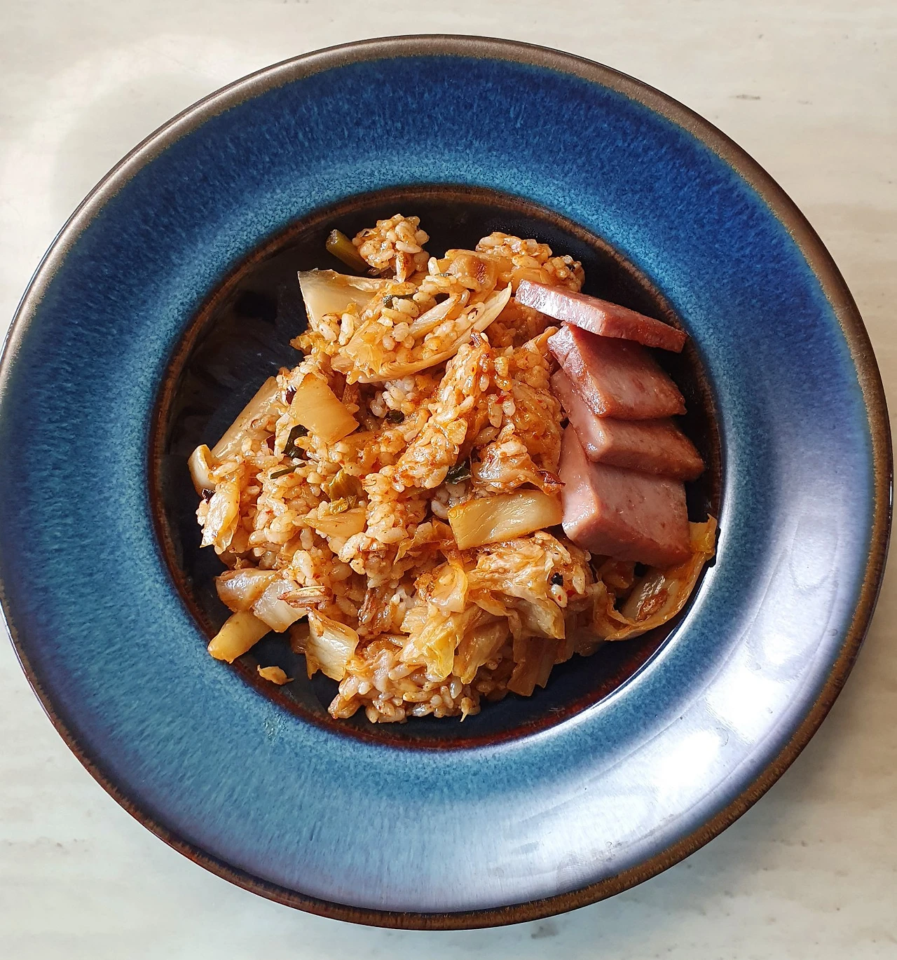 우리 가족은 점심으로 김치볶음밥을 먹기로 했다. 신랑이 재빠르게 부엌으로 가서 요리를 했다.