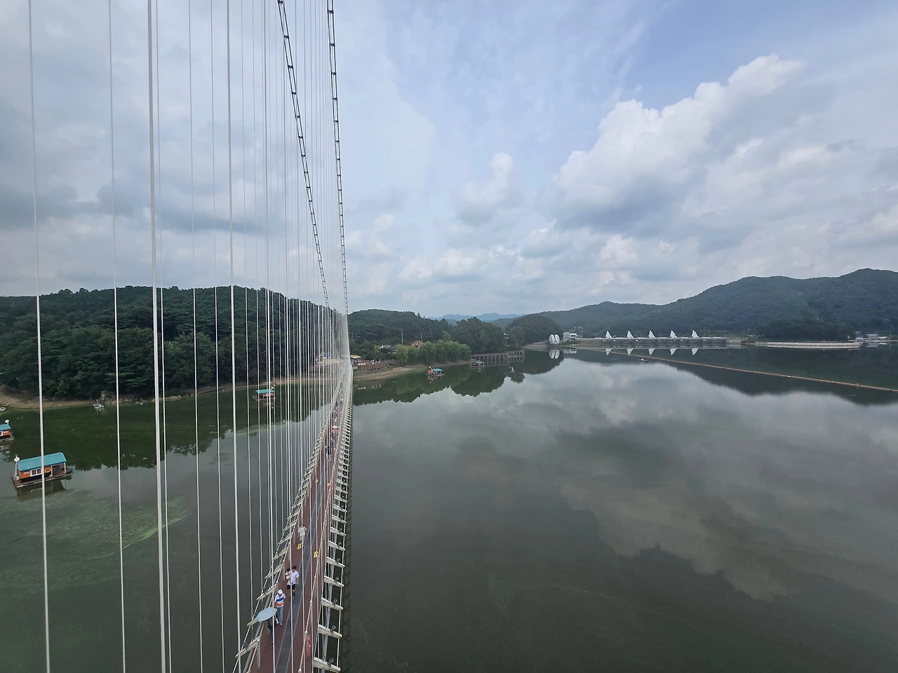 아이들이 다리 건너편으로 향하는 것을 확인하고 숨을 고르니 호수 바람이 시원하게 얼굴을 때렸다. 마음이 조금 진정되었다. 다리 건너편 풍경이 궁금해졌다. 따라갈까 하다 보내놓고 쫓아가는 그림은 아니다 싶어 말았다. 고개를 드니 마침 내가 멈춰 선 곳에 위로 올라가는 계단이 있고 계단 끝에는 전망대가 있었다. 혼자 전망대를 올랐다. 오늘따라 긴바지를 입어 그런지 바지가 무겁게 느껴졌다. 전망대에 오르니 저 멀리 남편과 아이들이 개미처럼 보였다. 높아지니 내 작은 마음이 보이고 멀어지니 애틋함이 밀려왔다.
