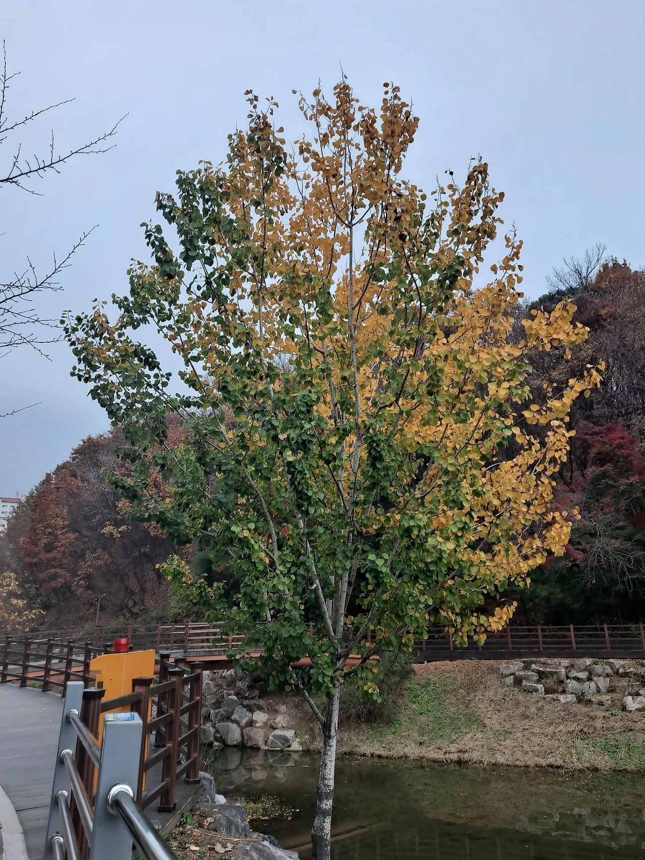 모네의 그림에서 나온 듯한 명화 같은 나무를 만났습니다. 가을인 듯 겨울인 듯 갈피를 잡기 힘든 기온 차에 나무도 혼란스러웠나 봅니다. 어제만 해도 아침부터 낮까지 오싹하게 춥다가 저녁때가 되면서 오히려 기온이 올라 어리둥절했더랬지요. 요즘 제 옷차림 마냥 단풍도 어정쩡합니다.