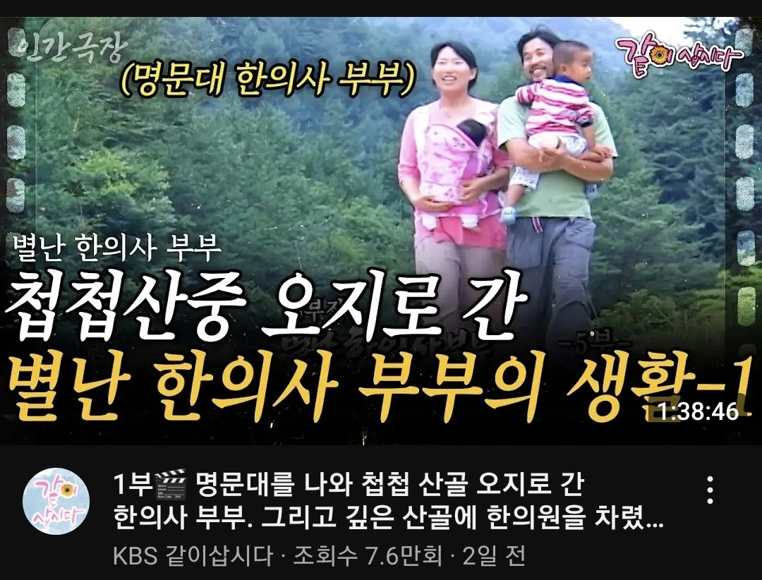 다음주가 걱정스럽고 불안한 마음에 연신 뉴스를 들락거립니다. 정신적 피로가 켜켜이 쌓여갑니다. 환기가 필요하던 차에 우연히 <인간극장>을 보게 됐습니다. 2009년도에 방영되었던 편으로 사람들이 자연 속에서 치유받을 수 있는 한의원을 만들고자 봉화 산속으로 간 한의사 부부의 이야기입니다. 태어난 지 갓 한 달이 된 아기와 3살 배기 첫째, 가족의 중심인 씩씩하고 명석한 아내, 꿈에 그리던 산속 한의원을 손수 짓는 남편, 후반부에는 남편의 부모님, 형, 형의 반려견들까지 대가족을 이루게 되는 이야기인데요.