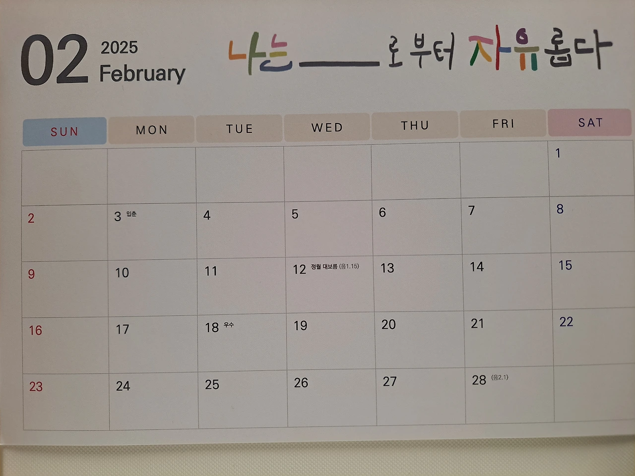 친구가 선물해 준 달력에 달마다 멋진 문구가 쓰여 있는데요. 2월의 문장은 '나는 __로부터 자유롭다'입니다. 무엇으로부터 자유로워질지 겨울의 마지막날 자기 전까지 곰곰이 생각해 봐야겠습니다.