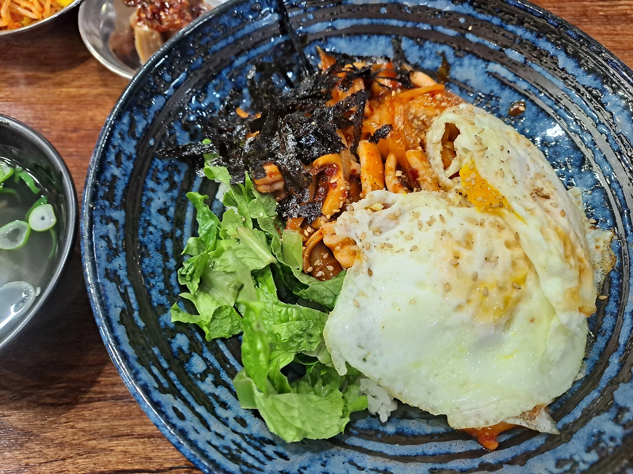 오징어 덮밥에 계란후라이 두 개를 추가하는 사치를 부렸습니다. 혈당 급상승, 고속 노화를 막고 단백질 보충을 위해 계란을 먼저 먹어야 한다는 메시지를 여기저기서 무한히 듣다 보니 세뇌된 계란 만능설, 어제 해가 지고 마신 커피의 영향으로 말똥한 밤을 보낸 뒤 무겁게 덮쳐온 피로를 많이 먹는 것으로 밀어내겠다는 미련한 계획이 결합한 결과입니다.