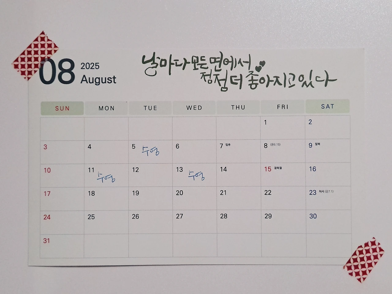 친구에게 선물 받은 탁상 달력입니다. 달마다 문구가 좋아서 제가 주로 앉아서 시간을 보내는 곳에 붙여두었습니다. 8월의 문구는 '날마다 좋은 면에서 점점 더 좋아지고 있다'입니다. 정말 그랬으면 좋겠습니다. 잘 찾아보면 아주 사소한 것이라도 하루에 하나쯤 좋아지는 면이 있겠지요?