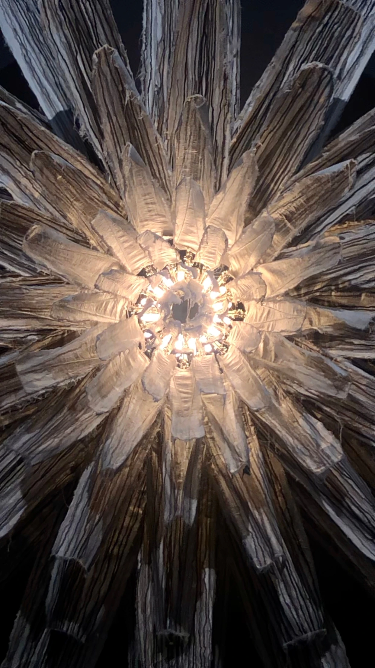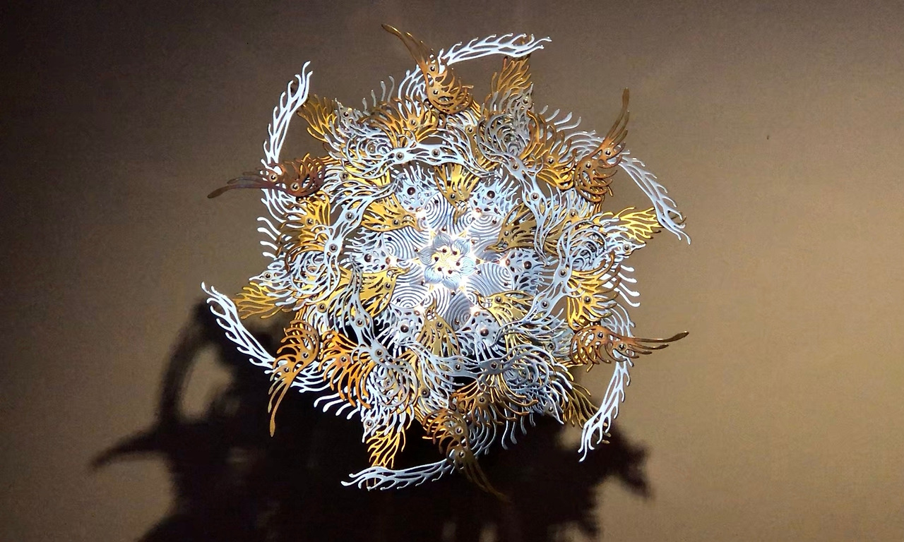겹겹의 금속 층에서 여러 개의 축이 돌아가는데도, 서로 부딪히지 않는 날개가 신기하다. 움직임은 매우 부드럽다. 샤크라 램프는 날개가 닫히면 완벽한 원판모양이 된다. 중심부의 꽃봉오리가 빛을 뿜으며 피어나면 다시 날개 모양의 꽃잎들이 펼쳐지는데, 꼭 살아 숨 쉬는 요정의 요람 같다. 가운데 꽃봉오리에서 요정이 태어날 것만 같은! 그러다 가만히 서서 계속 바라보면, 각자의 자리에서 한 치의 오차도 없이 부지런히 생명을 발산하는 그 움직임이, 사람의 장기 같기도, 우주 같기도 하다.