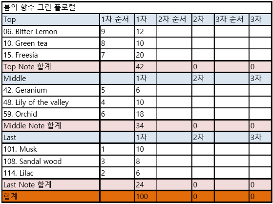 향긋한 봄날의 향기를 어떻게 전달할 수 있을까 하는 고민 하다, 첫 시작은 프리지어와 그린티로 가볍게 여기에 산뜻한 레몬이 가벼운 향긋함을 더 가까이 전하고 제라늄과 오키드의 초록 향기가 천천히 다가가도록 해봤어 그럼 어느샌가 라일락과 머스크의 편안함이 내가 만든 봄을 전해주어서 너의 아름다움이 더 선명해질 거 같았거든.