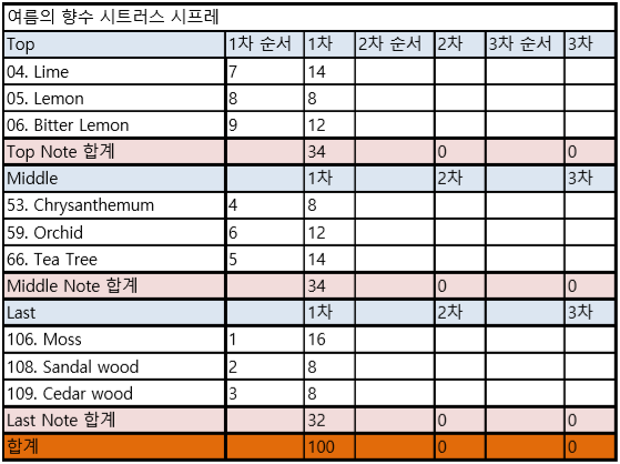 상상만 해도 침이 고이는 상큼함은 정말 여름이 아니면 언제 또 쓸 수 있을까 생각하면서 만들었어 물론 취향은 살짝 아니지만 그래도 생각하는 마음으로 이뻐해 주길 , 라임의 선명함과 레몬이 반짝이는 별 빛처럼 다가갈 거야 그리고 티트리와 국화의 싱그러움은 늘 질리지 않게 만들어 줄 거고, 오키드의 은은함은 마지막까지 편안하게 곁에서 산달우드와 모스에 실려 편안함을 줄 거야 하루를 마무리하고 가벼운 마음으로 좋은 꿈을 만날 수 있게 꼭 그렇게 내가 늘 바라니까.