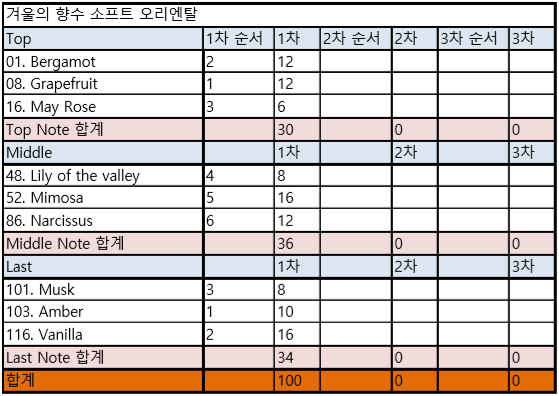 자몽이 쌉싸름한 색채가 너에게 활력을 주길 바라면서 은은하게 퍼지는 물결처럼 장미로 너를 표현하고 따스한 미모사와 수선화는 나에게 마냥 여리게 보이는 너를 더욱 아름답게 해 줄 거라 생각했어 하얀 향기로 가득하길 바라며 네가 많이 좋아하는 엠버의 포근함은 품에 잠든 아기처럼 사랑스럽게 느껴지겠지 아! 그리고 바닐라로 조금은 더 달게 그렇게 만들었어 겨울은 조금 더 달콤해도 좋으니까