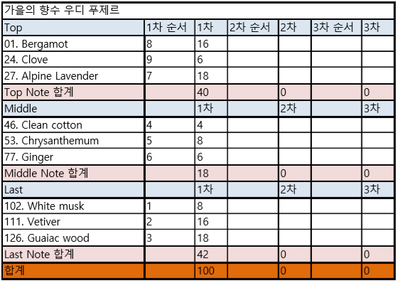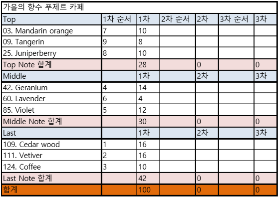 그 어디에 무언가를 놓고 온 듯한 아쉬움이 서린 나날들 흔히 가을을 타는 사람처럼 나도 이렇게 너를 기억하네 만다린과 주니퍼 베리의 살짝 건조한 듯 다가오는 오렌지 빛으로 가을의 정서를 전해주고 제라늄과 라벤더의 향기로 더욱 진해지면 제비꽃의 은은함에 시간이 흐르면 옅은 커피의 향미가 더 진하게 다가올 거야 식지 않는 커피같이 누군가 또 앉아서 기억할 탁자처럼 점점 선명하게