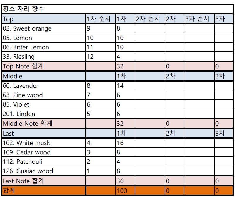 매력이 가득한 사람의 향기 그 시작은 가벼운 시트러스로 하였습니다, 스위트오렌지와 레몬의 풍성함을 가득 부여하면서도 가볍게 만들고 리슬링의 향기로 매력적인 모습을 표현하여 유쾌함을 만들어 보았어요, 봄이 다가오는 시기에 무엇으로 포인트를 더 할까 고민하면서 소나무를 선택하였고 미들 노트의 전체적인 분위기는 초록색을 많이 상상하면서 설정하였어요.