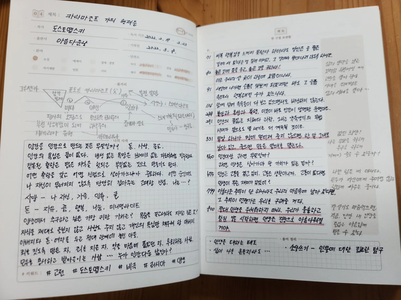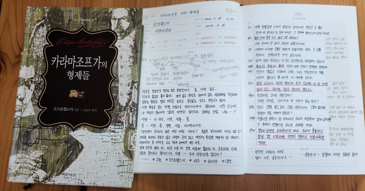 자식을 키우고 학원에서 아이들을 가르치며 학부모님들의 고민을 듣는 입장에서 카라마조프 가의 아버지와 그 자녀들을 통해 부모의 역할, 부모와 자식의 소통에 대해서도 생각해보게 되었다. 부모로서 자식에게 반드시 가르치고 베풀어야 할 덕목은 결국 사랑이다. 자신에 대한 사랑, 타인에 대한 사랑, 함께 하는 삶에 대한 사랑 말이다. 부모가 남긴 돈은 없어지기도 하고 욕심과 갈등을 키울 수 있지만 부모가 보여준 사랑은 자식이 살아가는 내내 따뜻하고 든든한 힘이 되어줄 것이라 믿는다. 그래서 나는 많은 돈을 자식에게 물려줄 수는 없더라도 넘치는 사랑을 전하기 위해 노력한다.