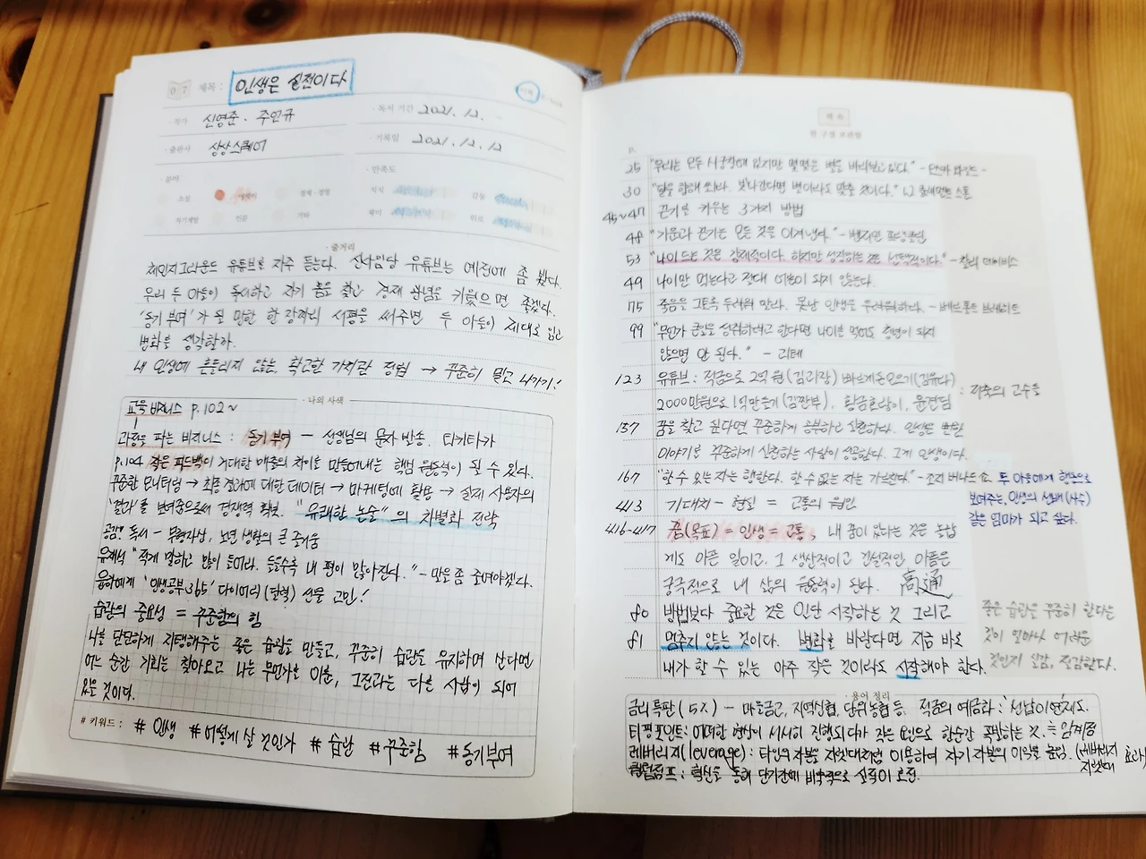 2021년 말에 읽은 책의 리뷰를 이제야 쓴다. 『인생은 실전이다』는 <신사임당>이라는 유튜브를 통해 알게 된 주언규와 《완벽한 공부법》을 읽고 알게 되었다가 <체인지 그라운드>라는 유튜브를 통해 익숙해진 신영준, 두 저자가 함께 집필한 책이다. 읽으면서 2, 30대 젊은이들에게 더 어울릴 법한 책이라는 생각이 들었다. 우리 두 아들에게 도움이 될까 싶어 같은 출판사에서 나온 《하루 공부 365》도 구입했는데 아들들에게 적극적으로 권하지 못하고 내 책장에 놓여 있다.