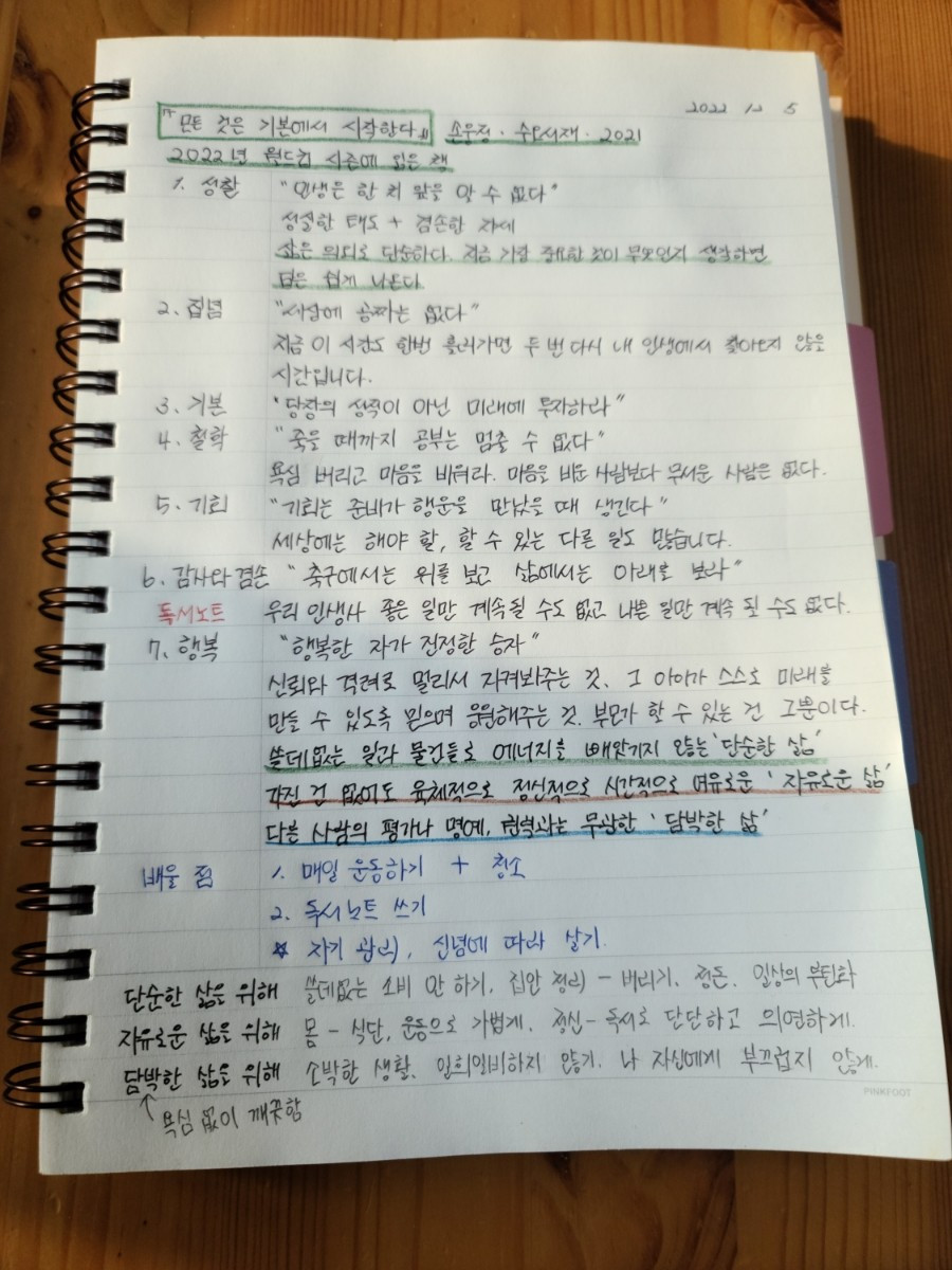 아버지가 항상 성실한 태도와 겸손한 자세를 강조해서 손흥민이 그렇게 좋은 선수가 되었구나 싶었습니다. 축구 경기장에서 잘 웃고 잘 우는 손흥민이 참 예쁘게 잘 자랐다는 생각이 들었는데 그 뒤에는 이런 아버지의 가르침이 있었네요. 힘든 시절을 집념과 성실성으로 이겨낸 사람이라 지금 그분이 누리고 있는 것들이 당연하다는 생각이 듭니다. 지금도 아들 손흥민과 함께 뛰기 위해 매일 운동을 하고, '죽을 때까지 공부는 멈출 수 없다'는 철학으로 독서 노트를 쓰며 책을 읽는다는 손웅정의 생활 태도가 존경스럽습니다. 그래서 저도 여기저기에 쓰던 독서 노트를 한 권에 잘 정리해보자 마음먹고 새 독서 노트를 쓰기 시작했습니다. 일주일 전부터 매일 할 수 있는 운동으로 하루 7분에서 10분 유튜브 보며 홈트를 하고 있고요.