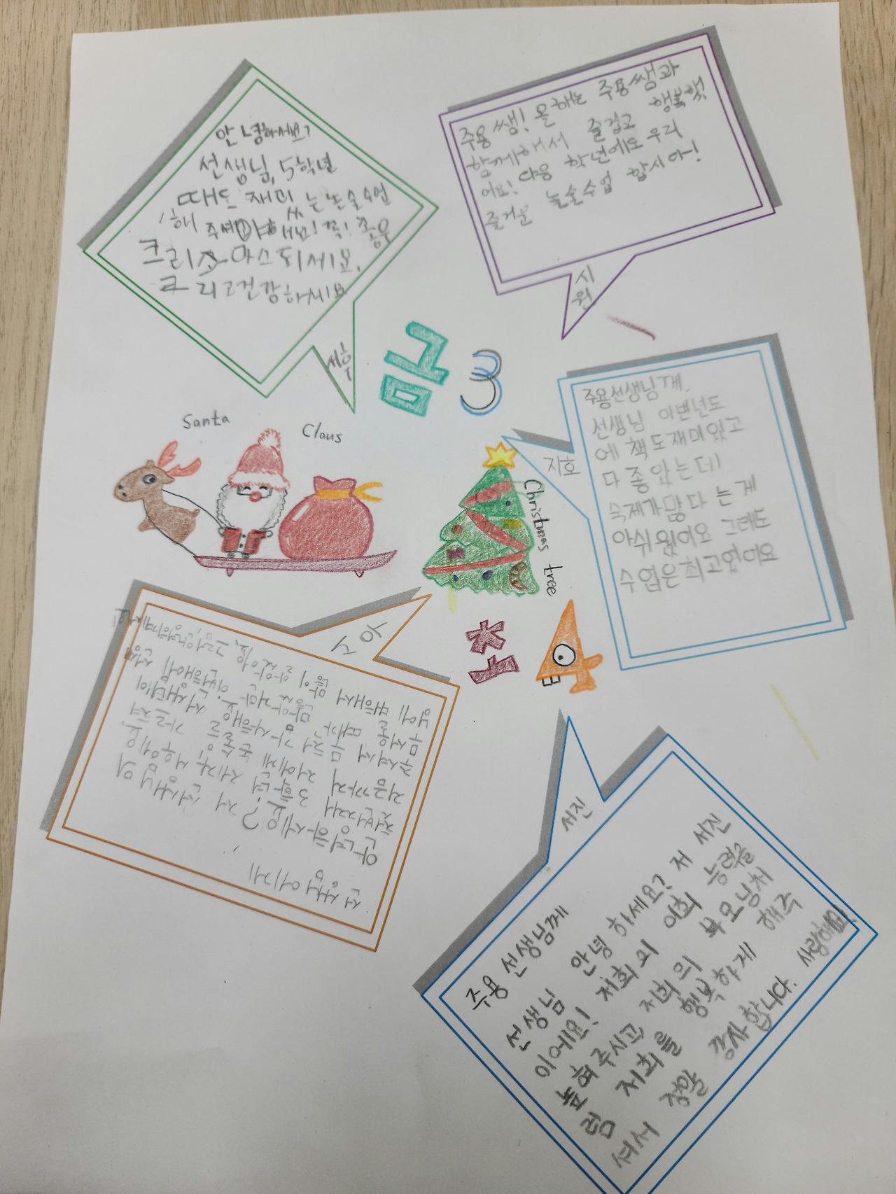 큰아들은 군대에 있고 작은아들은 재수생이었으니 올해는 여행을 생각하기 힘들었다. 내가 가르치는 아이들, 특히 초등학생들은 해외 여행도 많이 갔지만 나는 항상 같은 자리에서 같은 시간에 내 수업에 오는 아이들과 함께했다. 그래도 아이들과 함께하는 시간은 지루하지 않았고 덕분에 나는 내 일상을 여행처럼 설레는 마음으로 살 수 있었다. 나 혼자 있을 때는 크리스마스가 큰 의미 없이 지나갈 수 있었겠지만 아이들과 함께하니 내 마음이 그저 들떴다. 크리스마스파티를 준비하고 선물을 준비하면서 충분히 설렜다. 그런데 롤링 페이퍼로 아이들의 마음을 읽으니 나에 대해 표현하는 그 마음이 과분하고, 내가 더 잘해야겠다는 생각에 가슴이 벅찼다.