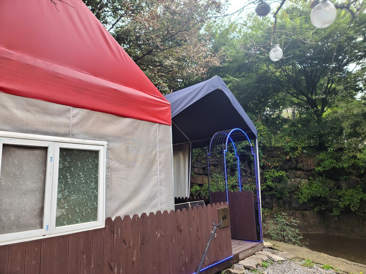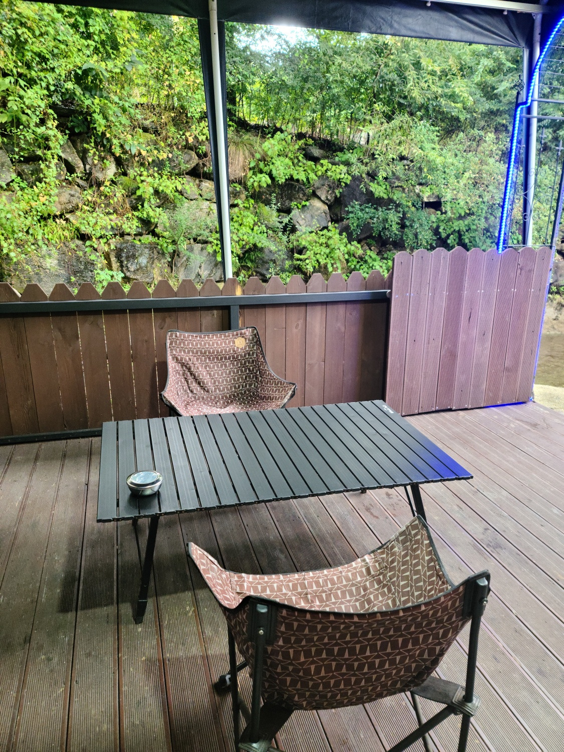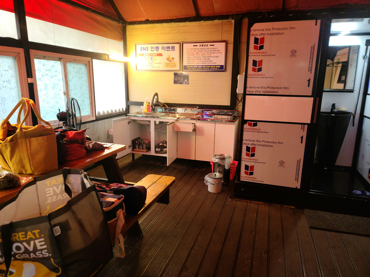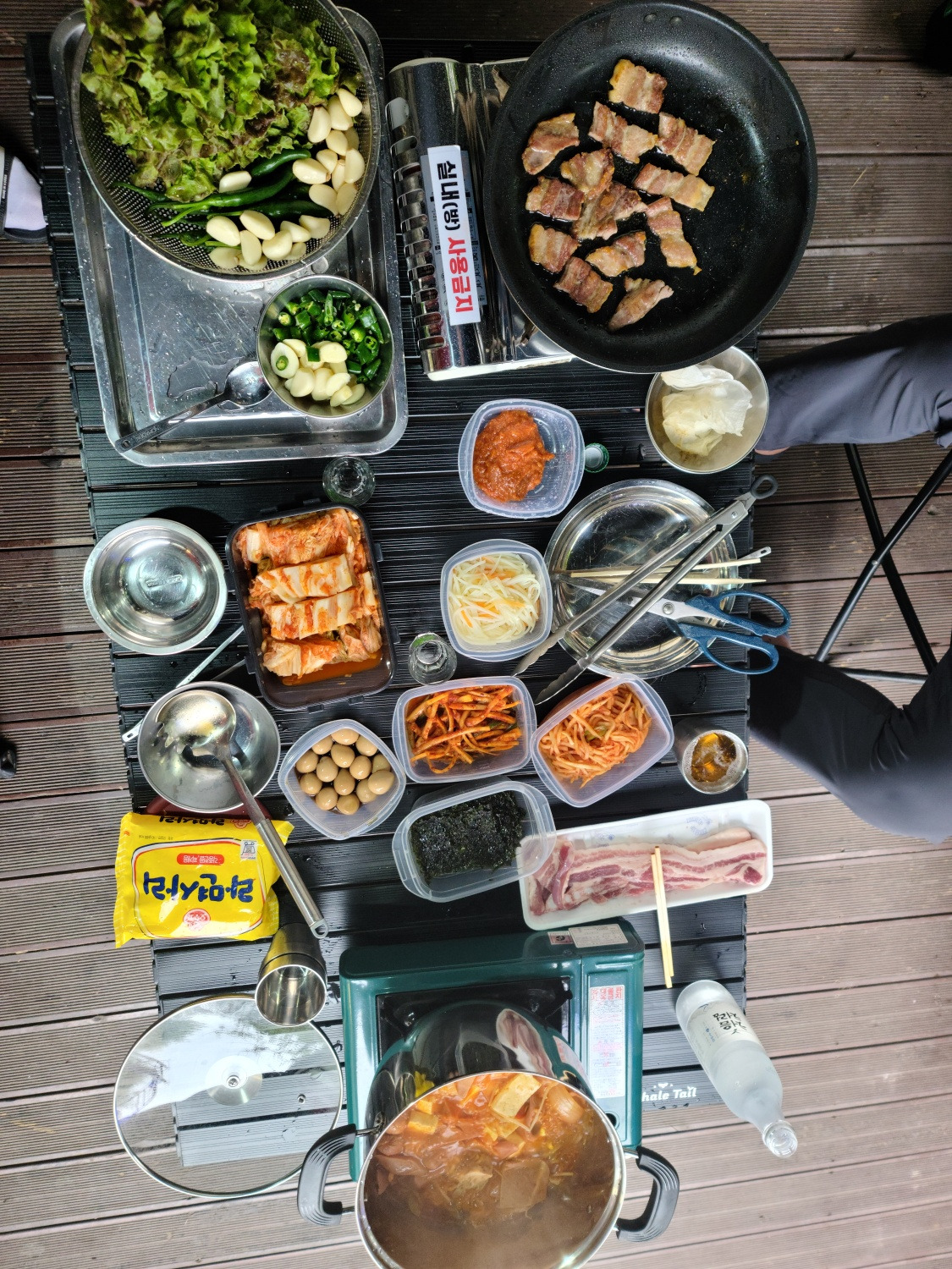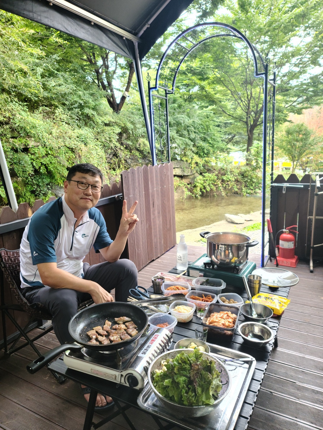 드디어<가평 별똥별 글램핑&카라반>의 우리 방 해 카라반이다. 사장님의 친절한 안내로 짐을 푸는데 정말 기대 이상이었다. 4평 짜리 카라반에 없는 게 없다. 화장실과 샤워실은 물론 둘이서 쓰기엔 너무 넓은 주방과 식탁, 그리고 아늑한 침실까지. 압권은 물 흐르는 소리를 곁에서 들으며 식사를 즐길 수 있다는 것이다. 달, 별, 해 카라반 중에 우리가 고른 해 카라반이 최고의 위치다. 남편도 만족하며 앞으로 자주 이용하자고 한다. 우리는 각 2만원씩 하는 바베큐와 불멍 서비스를 이용하지 않고 프라이팬에 고기 굽고 가져간 부대찌개와 밑반찬으로 충분히 풍성한 저녁을 즐겼다.