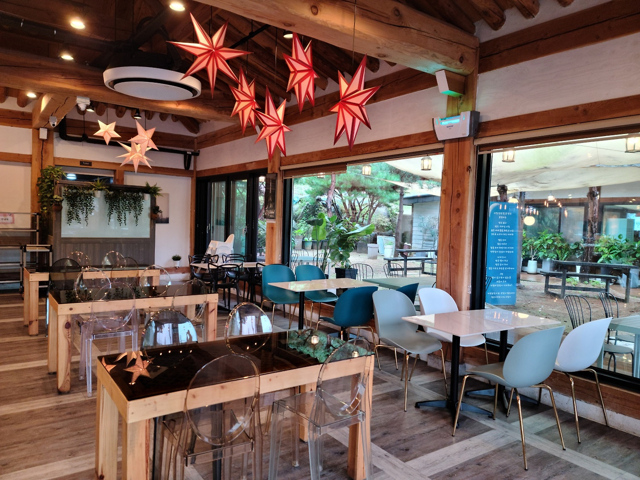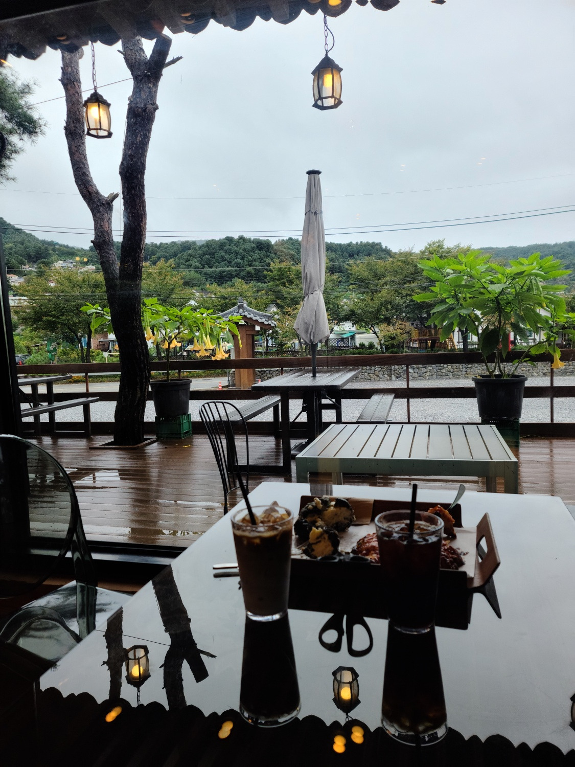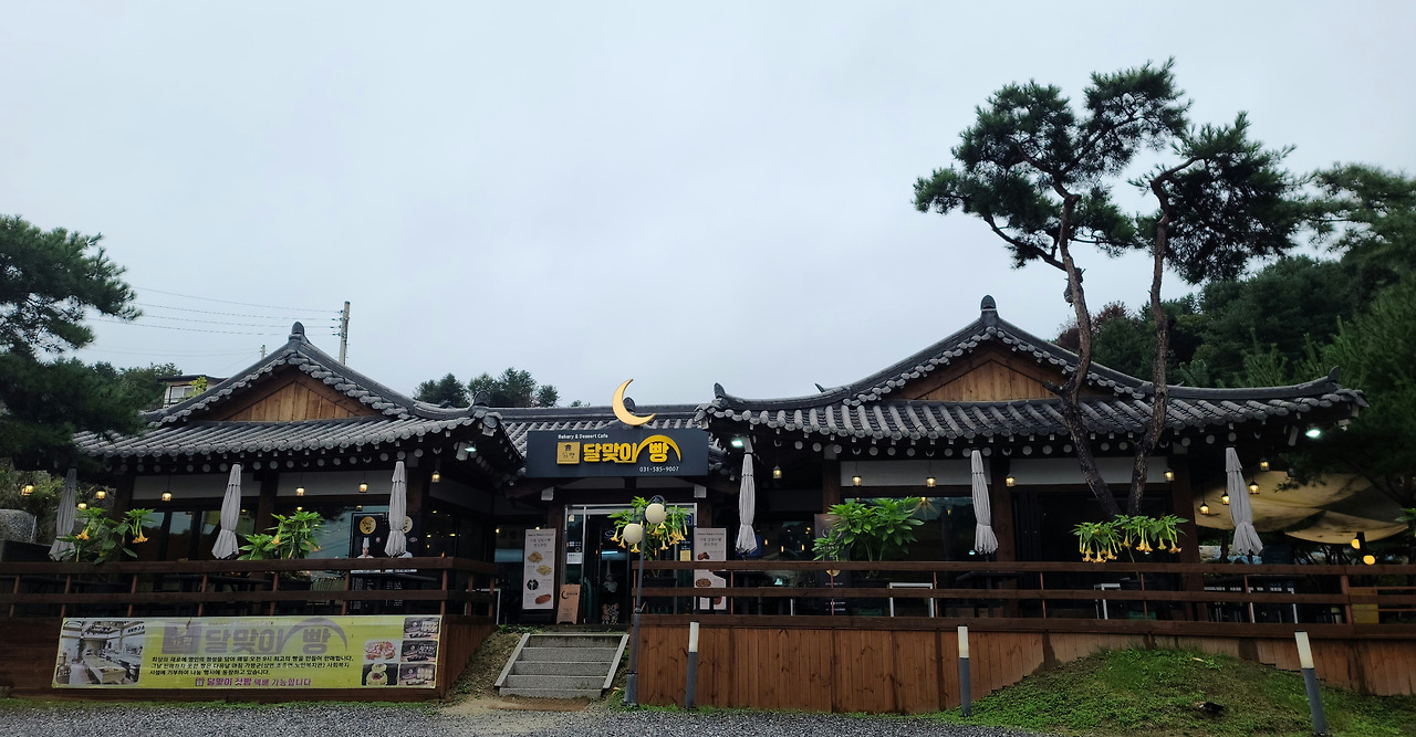 너무 일렀다. 길은 막히지 않고 보슬보슬 비 내리는 여행길은 운치 있었지만 아침에 문 여는 곳을 찾기 힘들었다. 카라반 들어가는 시간은 오후 3시인데 그때까지 어디를 가야 할지... 아침고요수목원에 가보기로 했다. 거의 20년 만이다. 오래 걸어야 할 테니 아침을 간단히 먹기로 했다. 검색해보니 가장 먼저 문을 여는 곳이가평 달맞이 빵집이다. 어쩔 수 없는 선택이긴 하지만 여행이니 일상과는 다른 아침도 괜찮을 것 같았다. 커피에 빵, 분위기 있는 아침 식사였다.