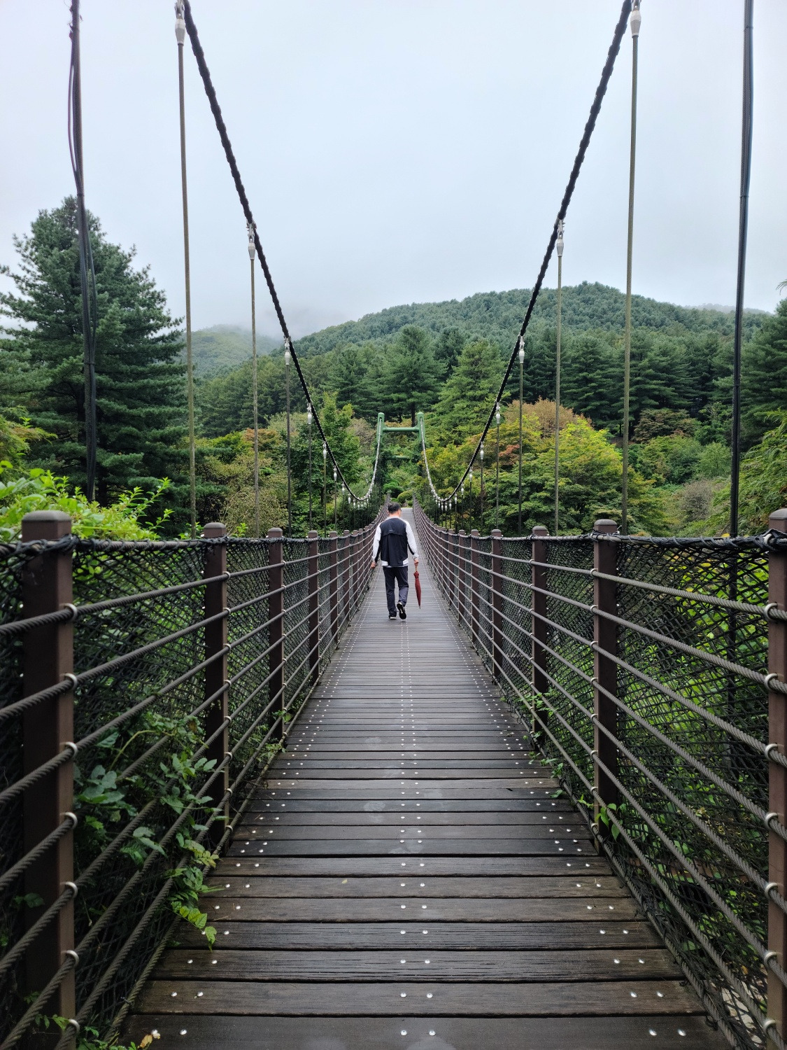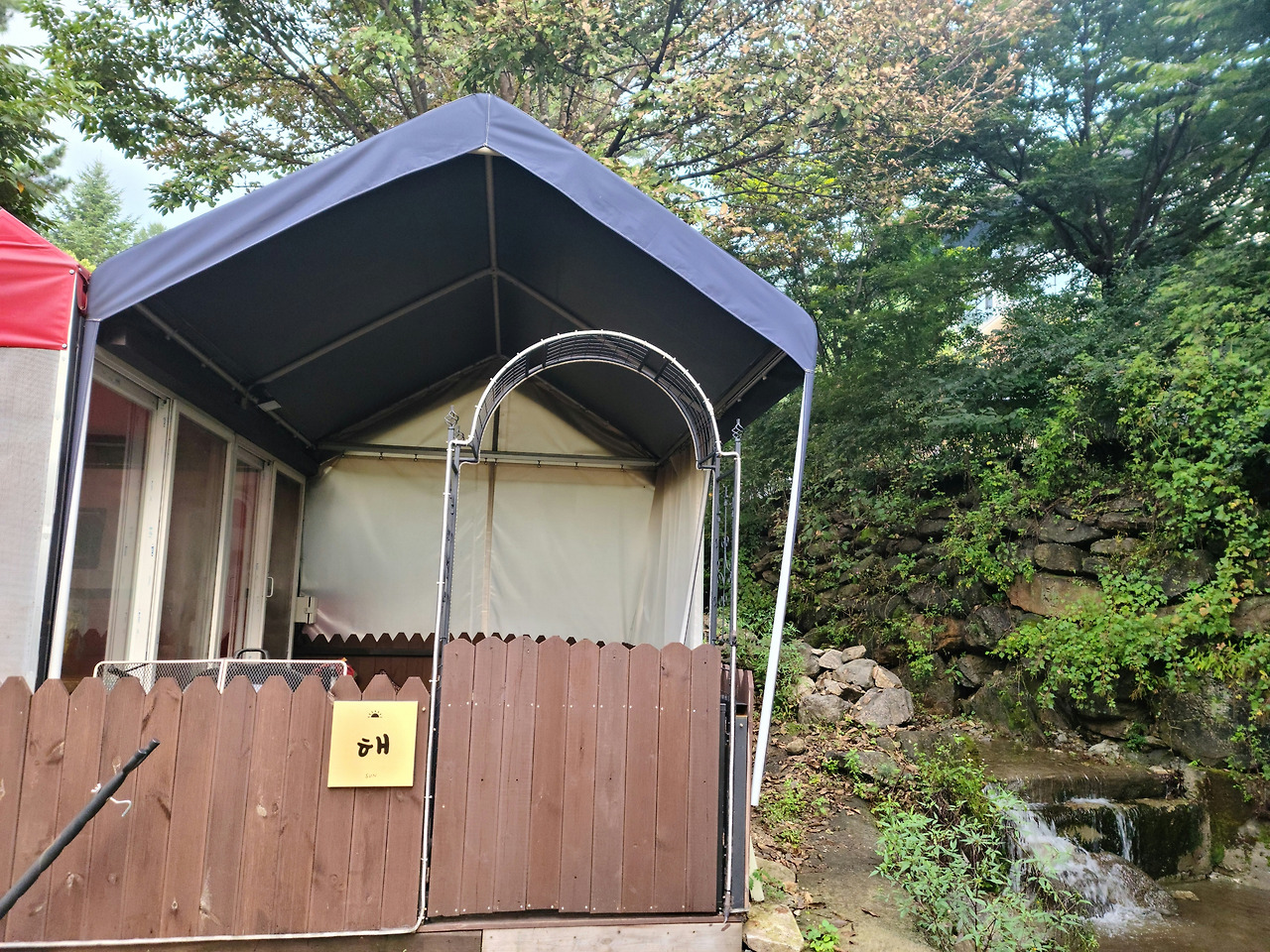 점심을 먹고 숙소에 들어갈 예정이었지만 배가 많이 고프지 않았다. 허기를 좀 참으면 한 끼 식비도 아낄 수 있고 여행지에서의 메인 식사를 더 맛있게 먹을 수 있을 것 같아 바로 숙소로 향했다. <가평 별똥별 글램핑&카라반>숙소 바로 옆이 유명산 주차장이다. 유명산 휴양림을 산책하며 다음 날 아침 유명산 등산을 계획했다. 우리 부부의 1박 2일 여행 코스가 만만치 않다.