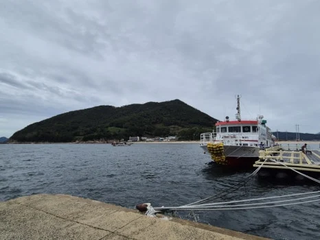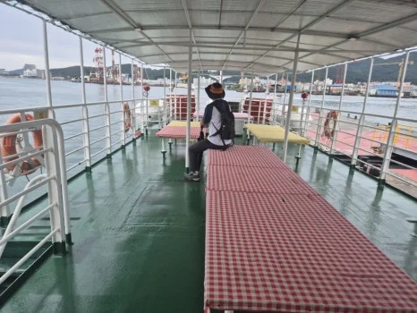 우리 부부 통영 3박 4일 여행, 두번째 날이 밝았다. 오늘 여행 코스는 비진도다. 가성비 좋은 <통영 그레이 호텔>에서 뽀송뽀송한 침구에 꿀잠을 잤다. 날씨가 약간 흐렸지만 트래킹 코스를 걸을 예정이라 해가 반짝한 날보다 더 나을 듯했다. 통영항 여객선 터미널에서 배 타고 40분 정도를 간다. 배를 타고 바다를 가르며 주변 경관을 바라보는 기분은 환상적이다. 비진도 내항을 지나 외항에서 내렸다.