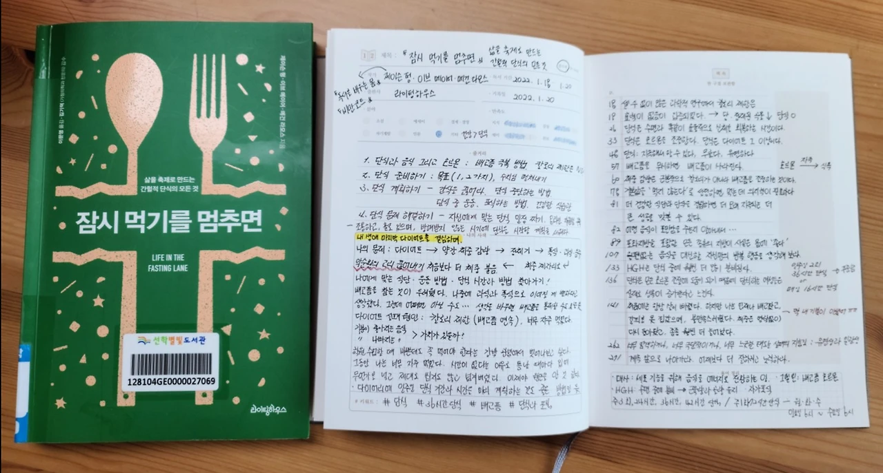100일 단주 후 일주일 동안 격일로 3일이나 술을 마셨다. 다시 예전으로 돌아갈까봐 두려웠다. 이러면 안 되지 하는 생각에 동기 부여를 할 만한 책을 찾았다. 비교적 최근에 나온 책 『잠시 먹기를 멈추면』 이 눈에 뜨였다. 간헐적 단식에 대한 기초 지식 정도는 알고 있었지만 이 책에서 나의 다이어트 실패 원인을 찾을 수 있을 것 같았다. 도서관에서 책을 빌려와 읽으며 전날의 야식과 음주에 대한 벌로 단식에 들어갔다. 계속 따뜻한 물을 마시고, 아메리카노 한 잔으로 위로를 삼으며 책 속으로 빠져 들었다.
