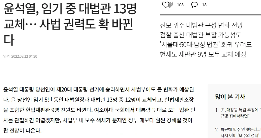 그러나 그보다 훨씬 큰 이슈들을 떠올리니 가슴이 답답해져 옵니다. 그중 하나만 우선 살펴보자면, 윤석열 당선자가 임기 5년 동안 대법관 14명 중 13명(대법원장 포함)을 새로 임명하고, 헌법재판관 역시 헌재 소장을 포함한 9명 전원을 임명한다는 사실입니다.