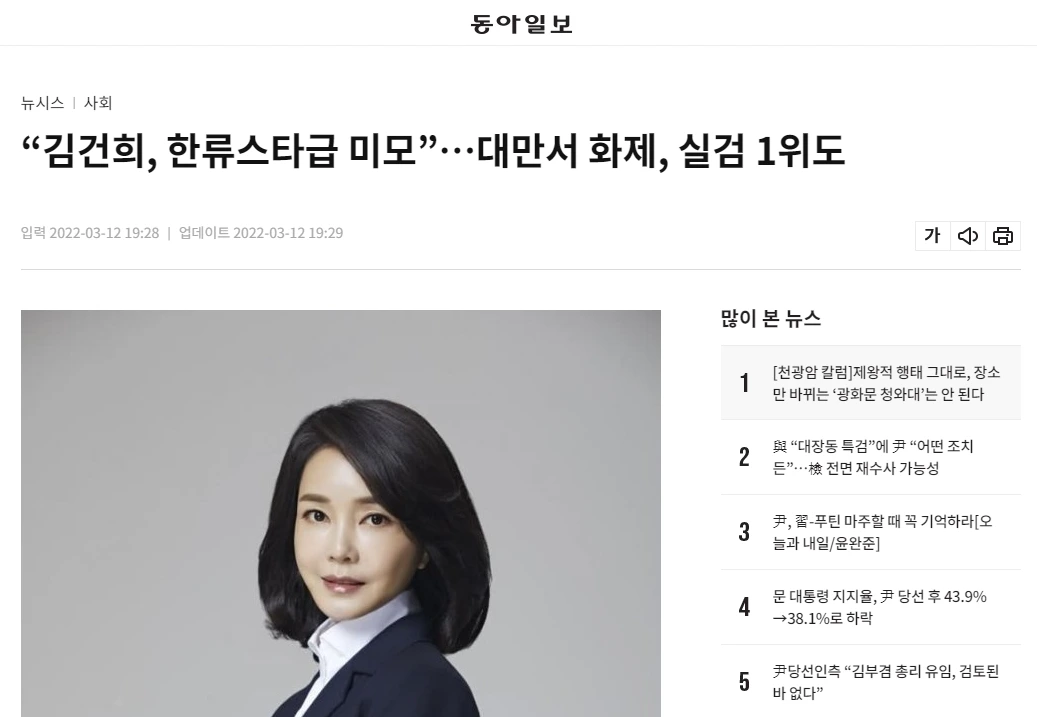 이어 동아일보는 ‘김건희, 한류스타급 미모가 대만서 화제이며 실검 1위’라고 기사를 올렸습니다. 그러나 실제 대만에서 다뤄진 원문 내용은 김건희의 외모 언급 외에도 학력위조와 논문 42% 표절 등을 다루는 전반적으로는 비판 논조의 기사였습니다.