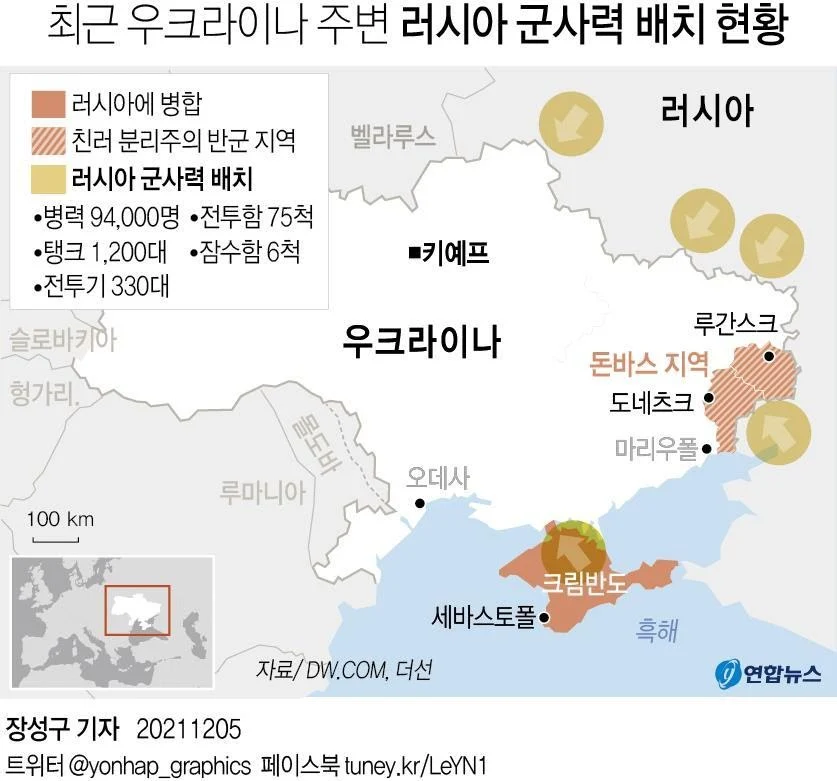 지난 12월 3일에 미 위싱턴 포스트지는 내년 초 러시아가 우크라이나를 침공할 수 있다고 전망하였습니다. 그리고 미국은 러시아 가스관 운영 개입이나 우크라이나에 더 많은 무기를 지원할 수 있다고 대응했고요. 이에 푸틴 대통령은 러시아와 접경한 우크라이나가 NATO(북대서양 조약기구)에 가입하지 않음을 보장하라고 요구하고 있습니다.